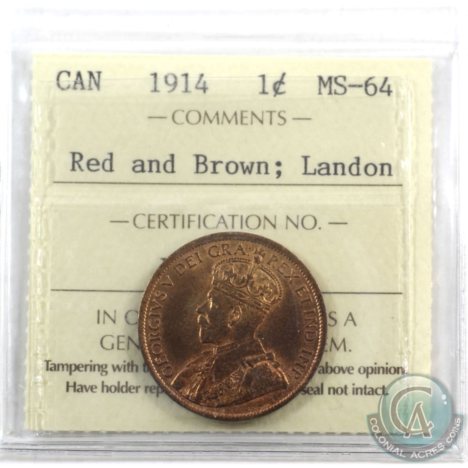 1-cent 1914 ICCS Certified MS-64 Red and Brown; Landon. 70% full red.