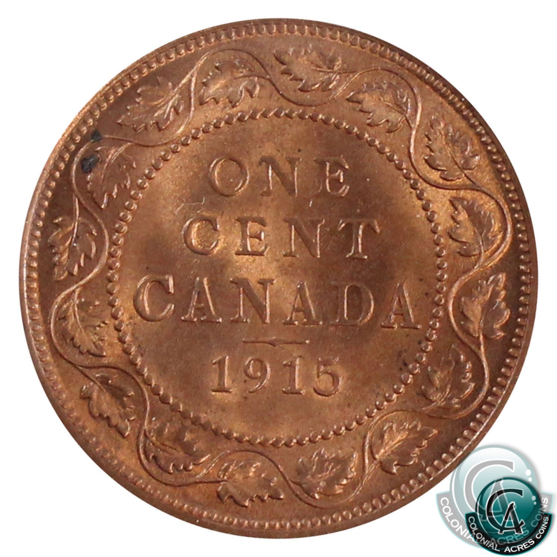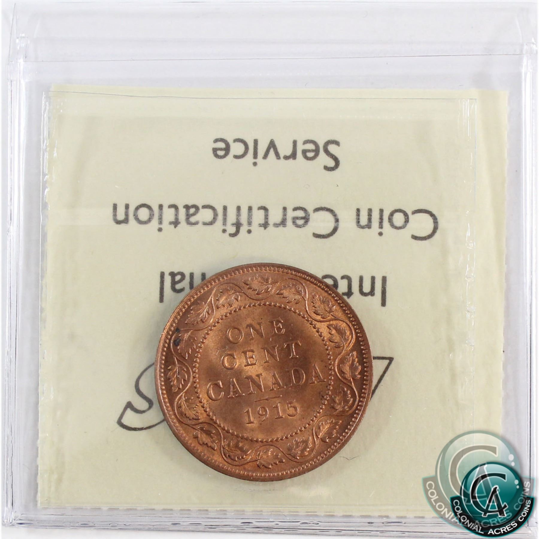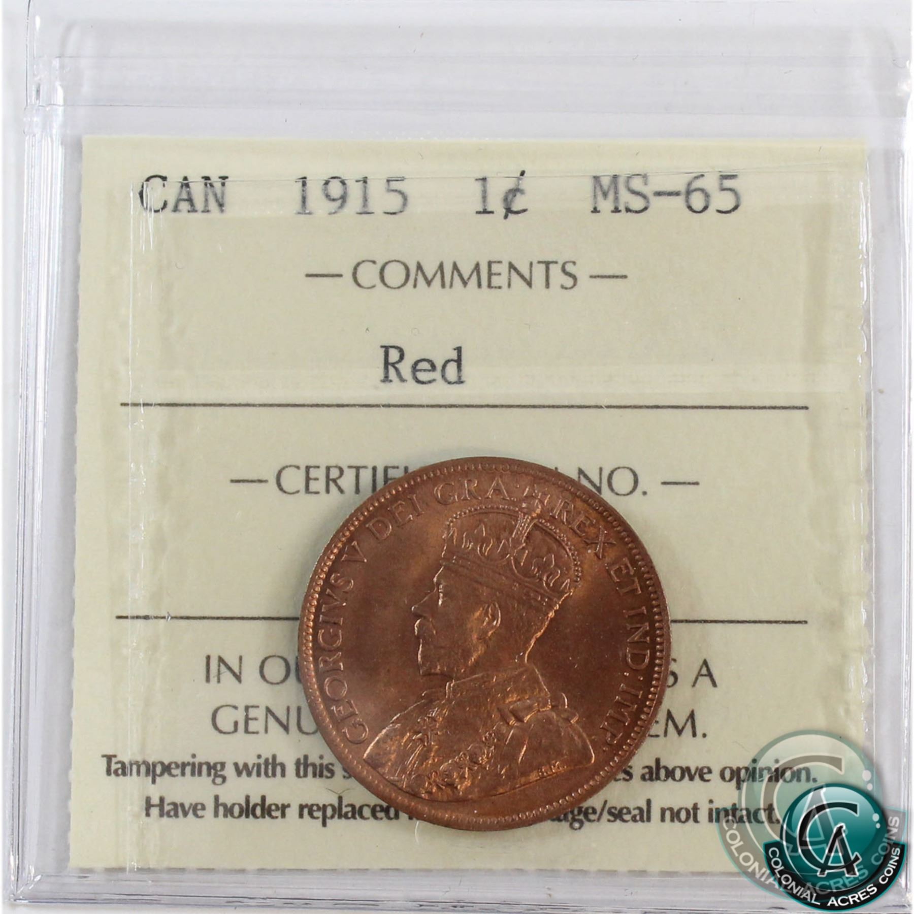 1-cent 1915 ICCS Certified MS-65 Red. A deep cherry red coin with original mint lustre.