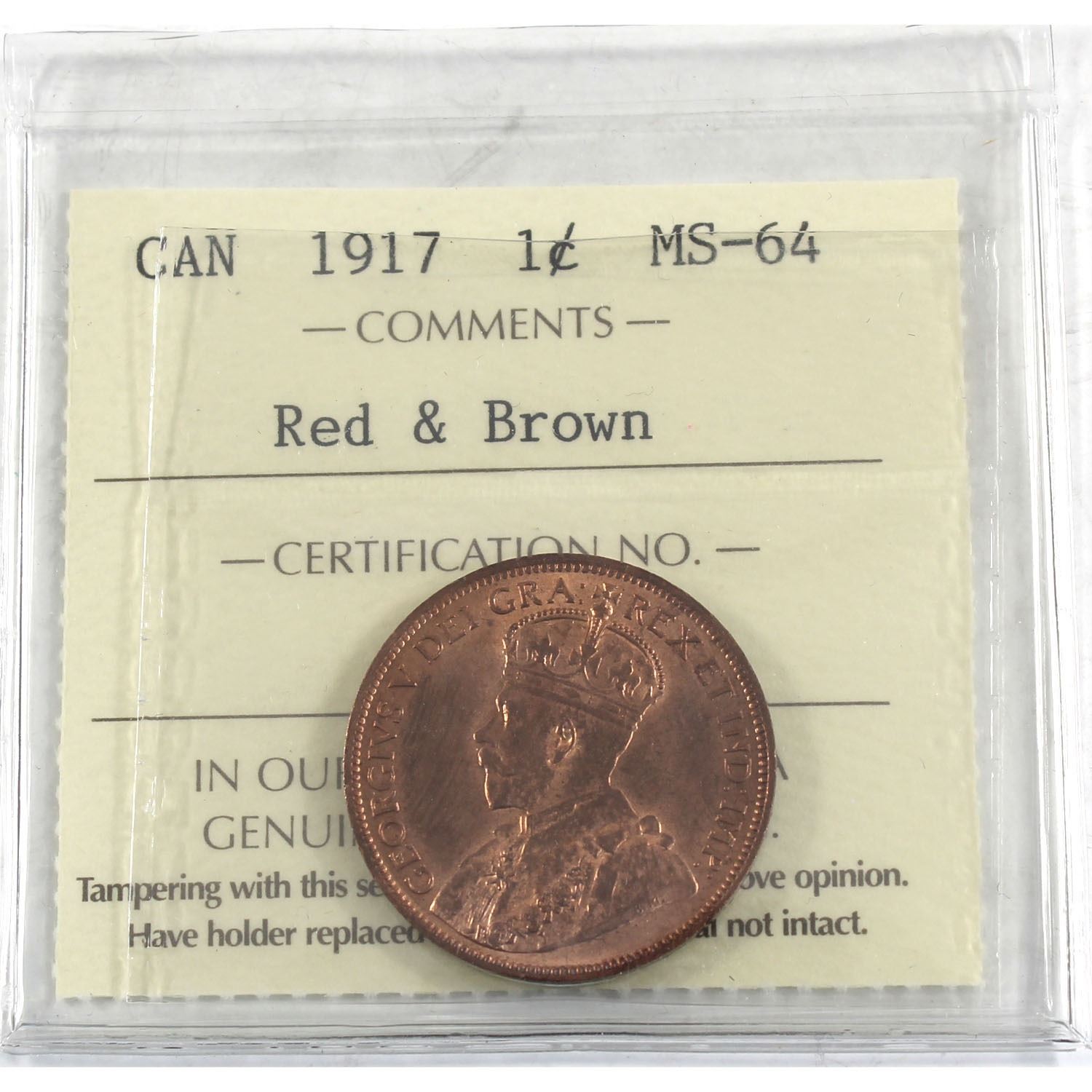 1-cent 1917 ICCS Certified MS-64 Red & Brown. A primarily red coin with soft satin fields. Great eye appeal.
