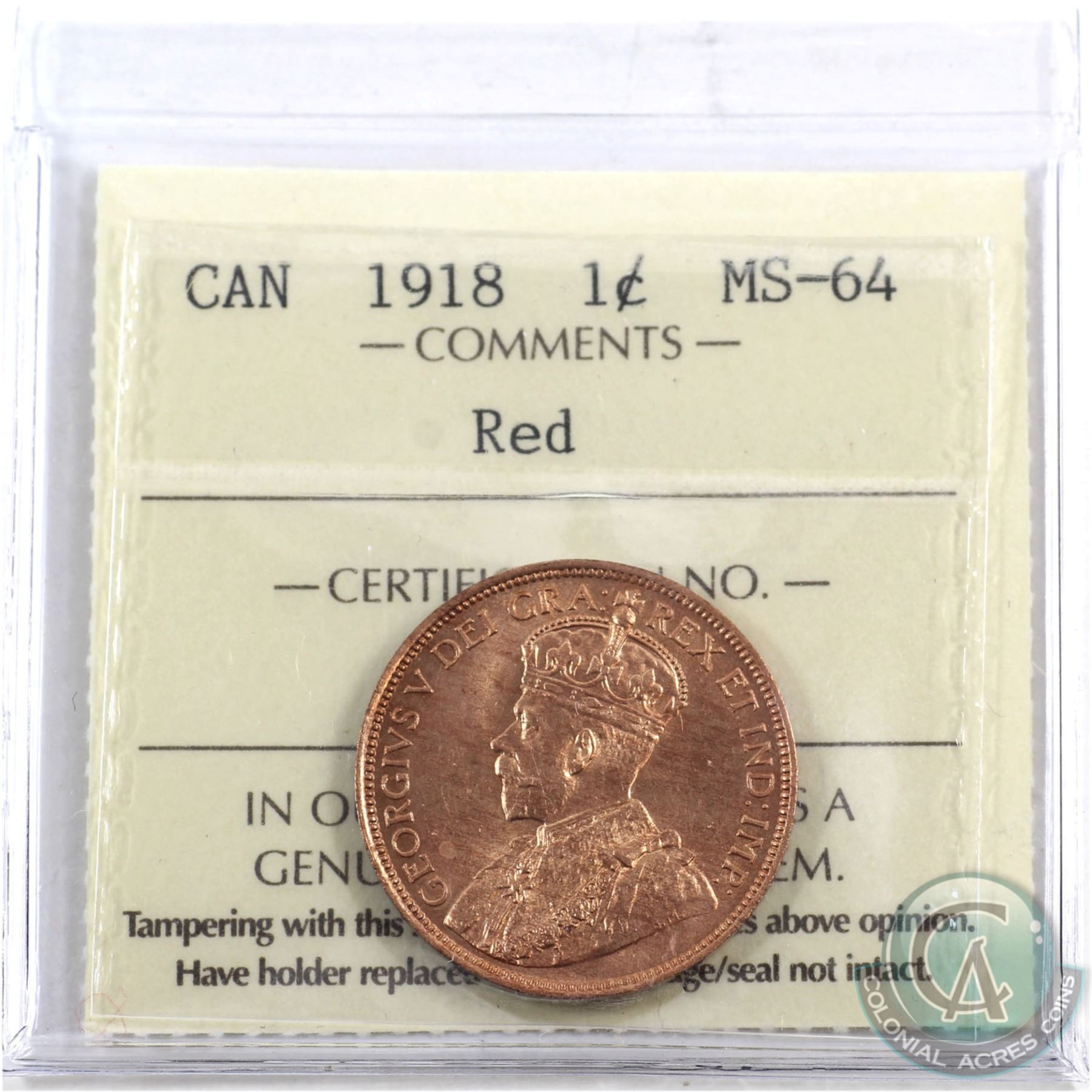 1-cent 1918 ICCS Certified MS-64 Red. Bright flashy coin with exceptional eye appeal.