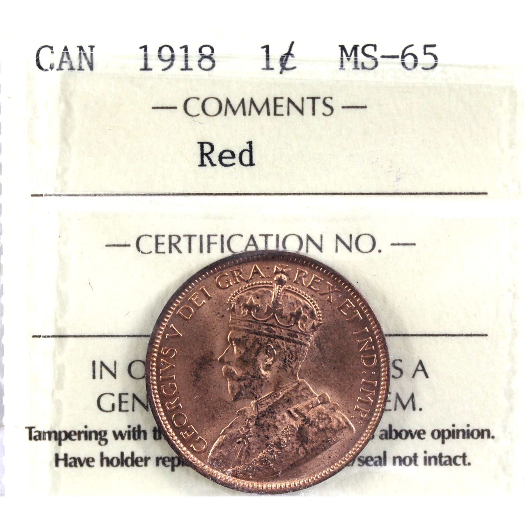 1-cent 1918 ICCS Certified MS-65 RED! Nice consistent colours throughout.