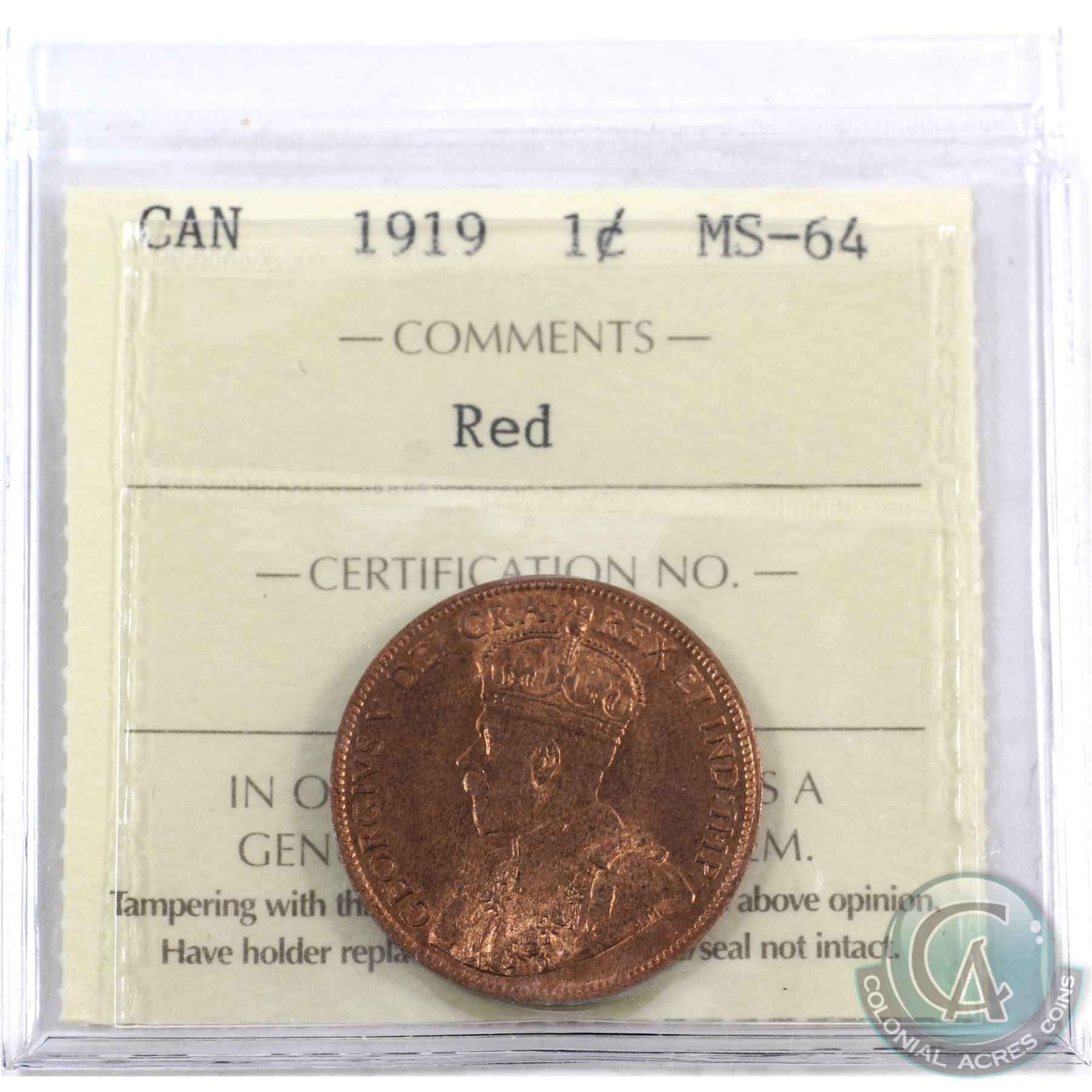 1-cent 1919 ICCS Certified MS-64 Red. Nice even lustre.