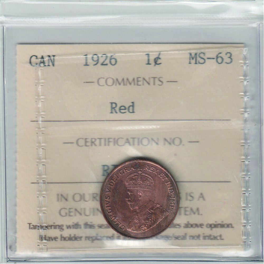 1-cent 1926 ICCS Certified MS-63 RED. A nice mint state example of this semi key date issue.