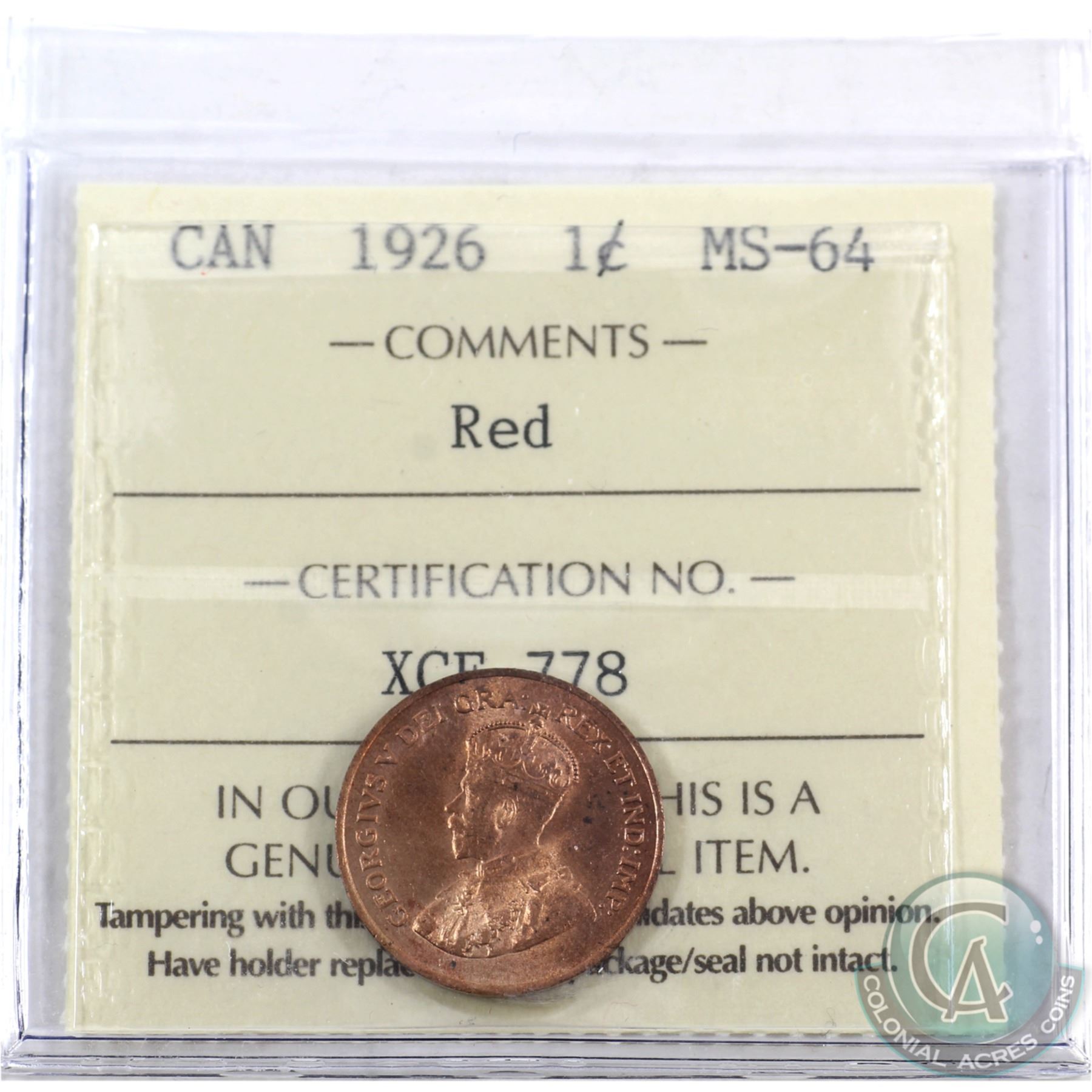 1-cent 1926 ICCS Certified MS-64 Red. Amazing eye appeal! Very tough to find this key date in mint state!