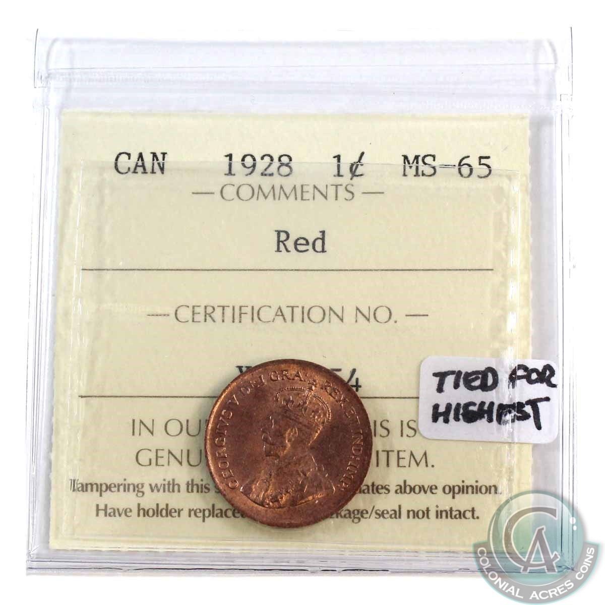 1-cent 1928 ICCS Certified MS-65 Red. Tied for Highest Grade.