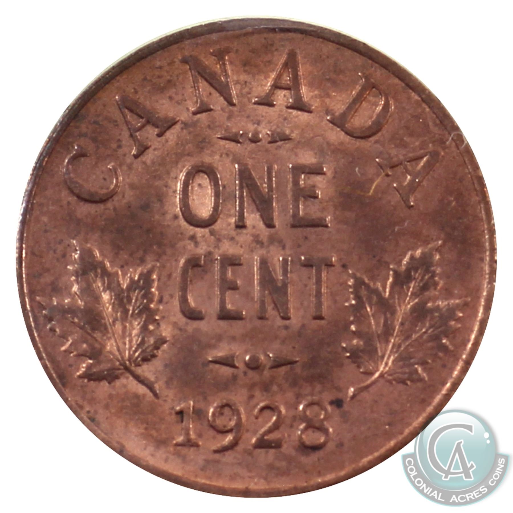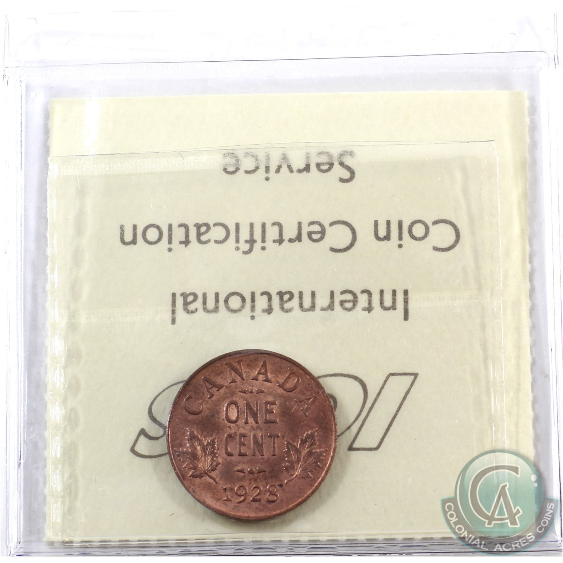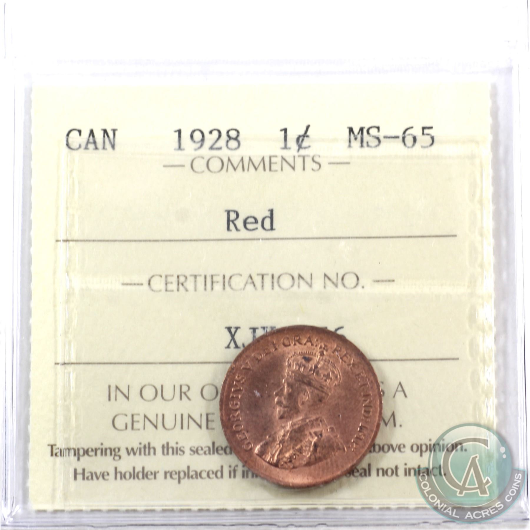 1-cent 1928 ICCS Certified MS-65 Red. Tied for the highest grade. A great full red coin with soft satin fields.