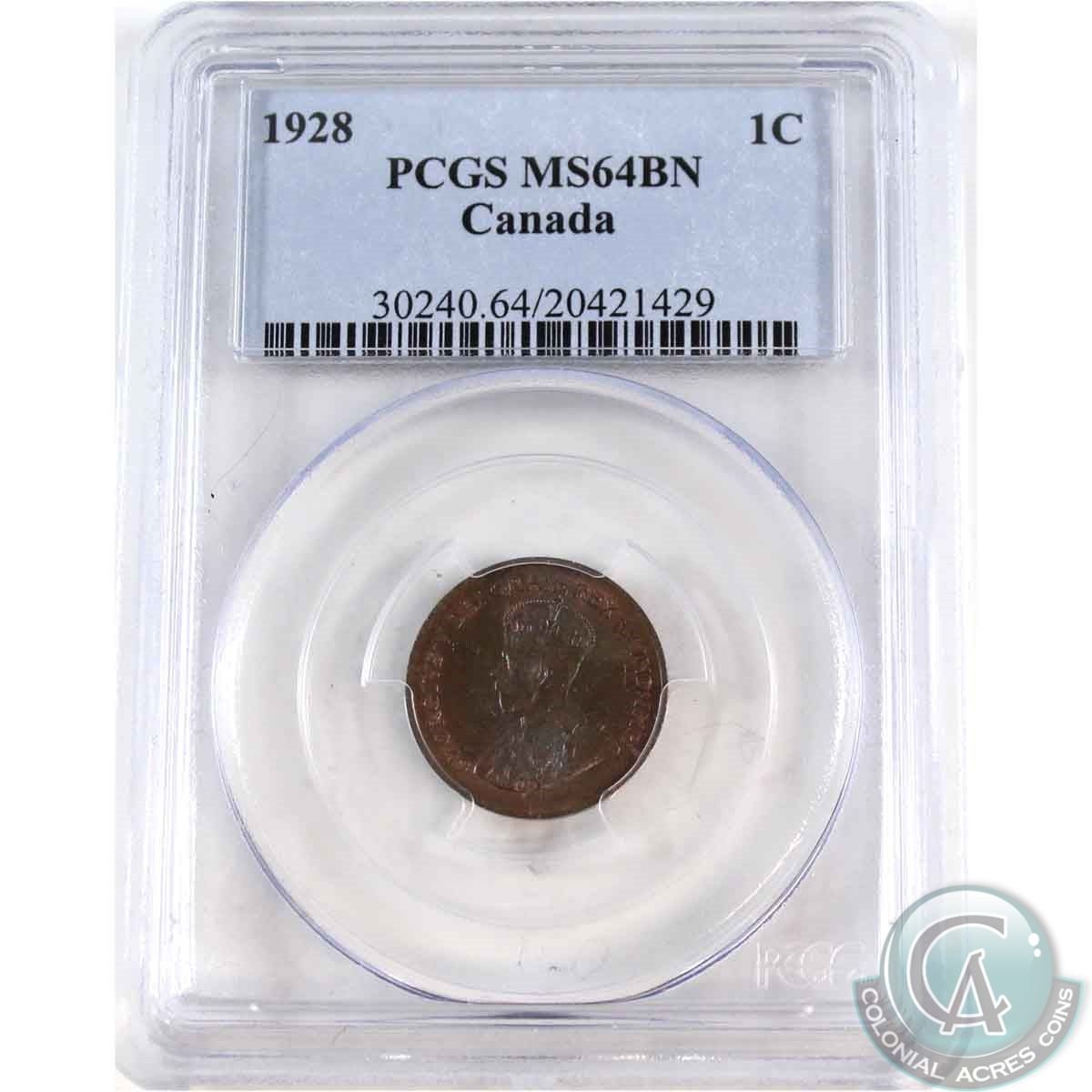 1-cent 1928 PCGS Certified MS-64 Brown. Coin contains an attractive blue glow with hints of red luster throughout.