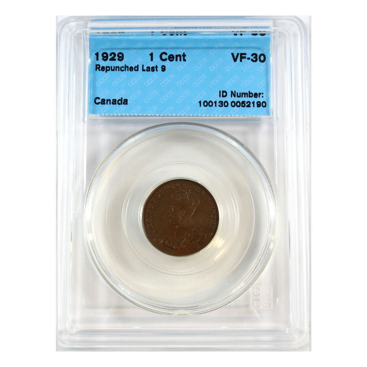 1-cent 1929 CCCS Certified VF-30. Rare, Repunched '9/9'.