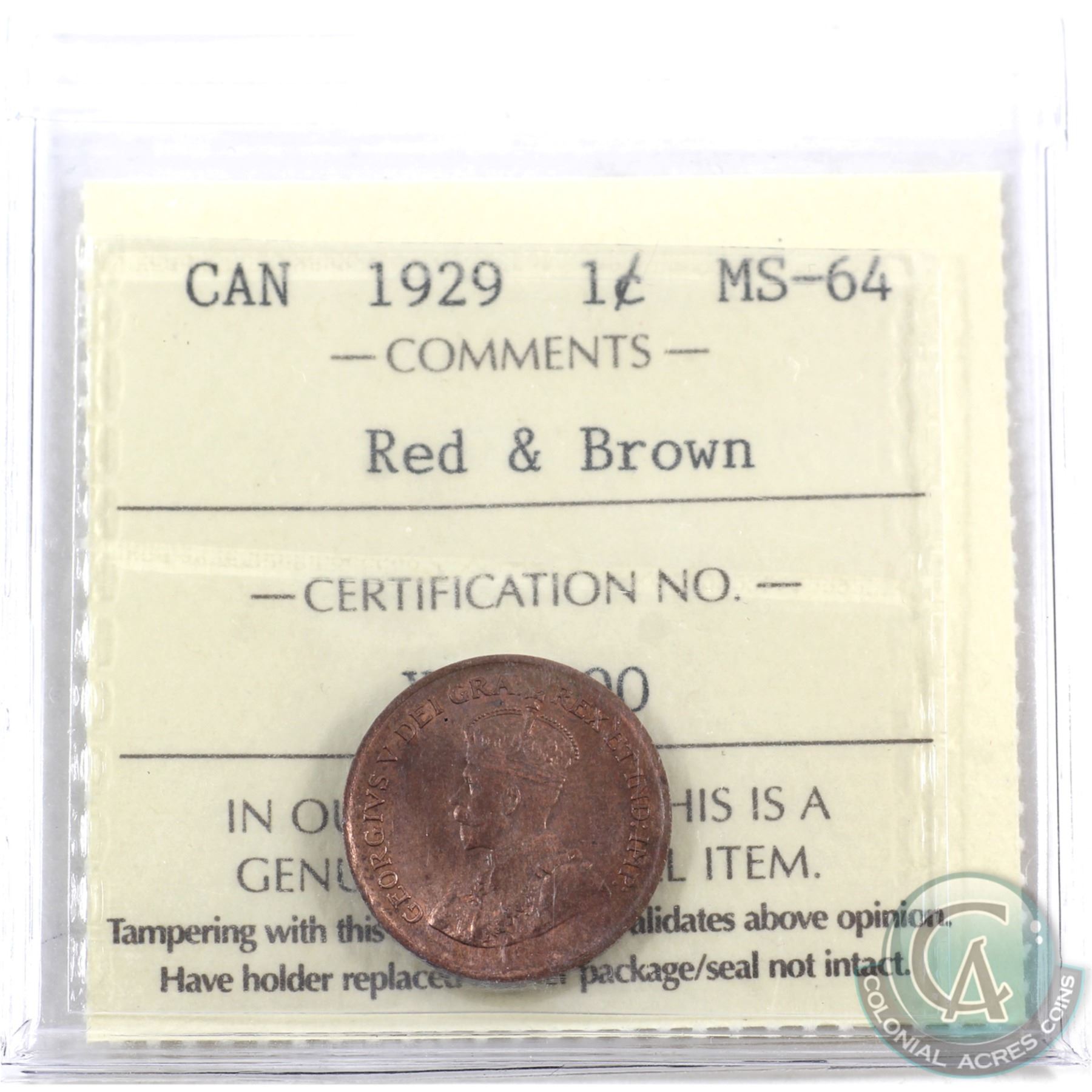 1-cent 1929 ICCS Certified MS-64 Red & Brown