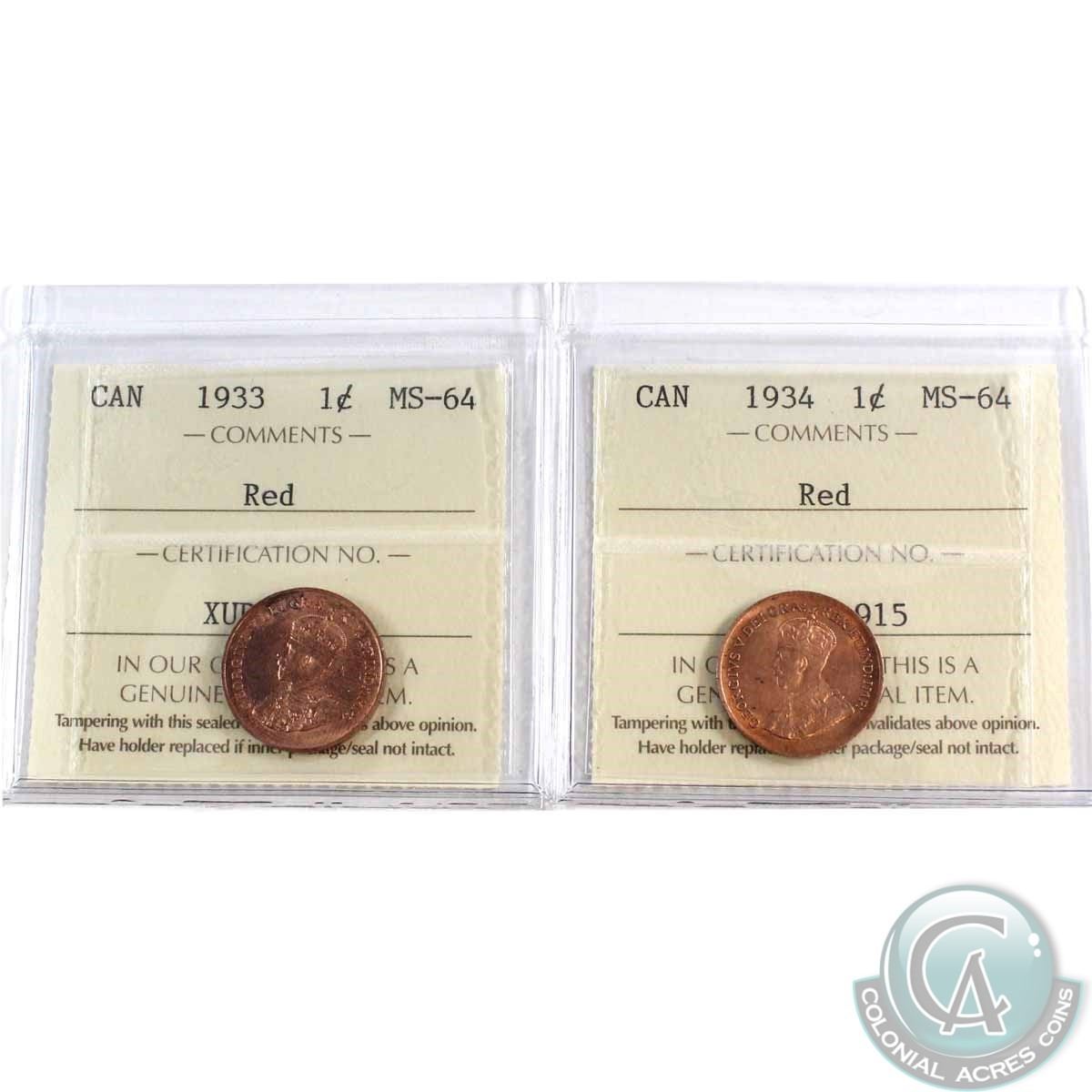 1-cent 1933 & 1934 Both ICCS Certified MS-64 RED! 2pcs
