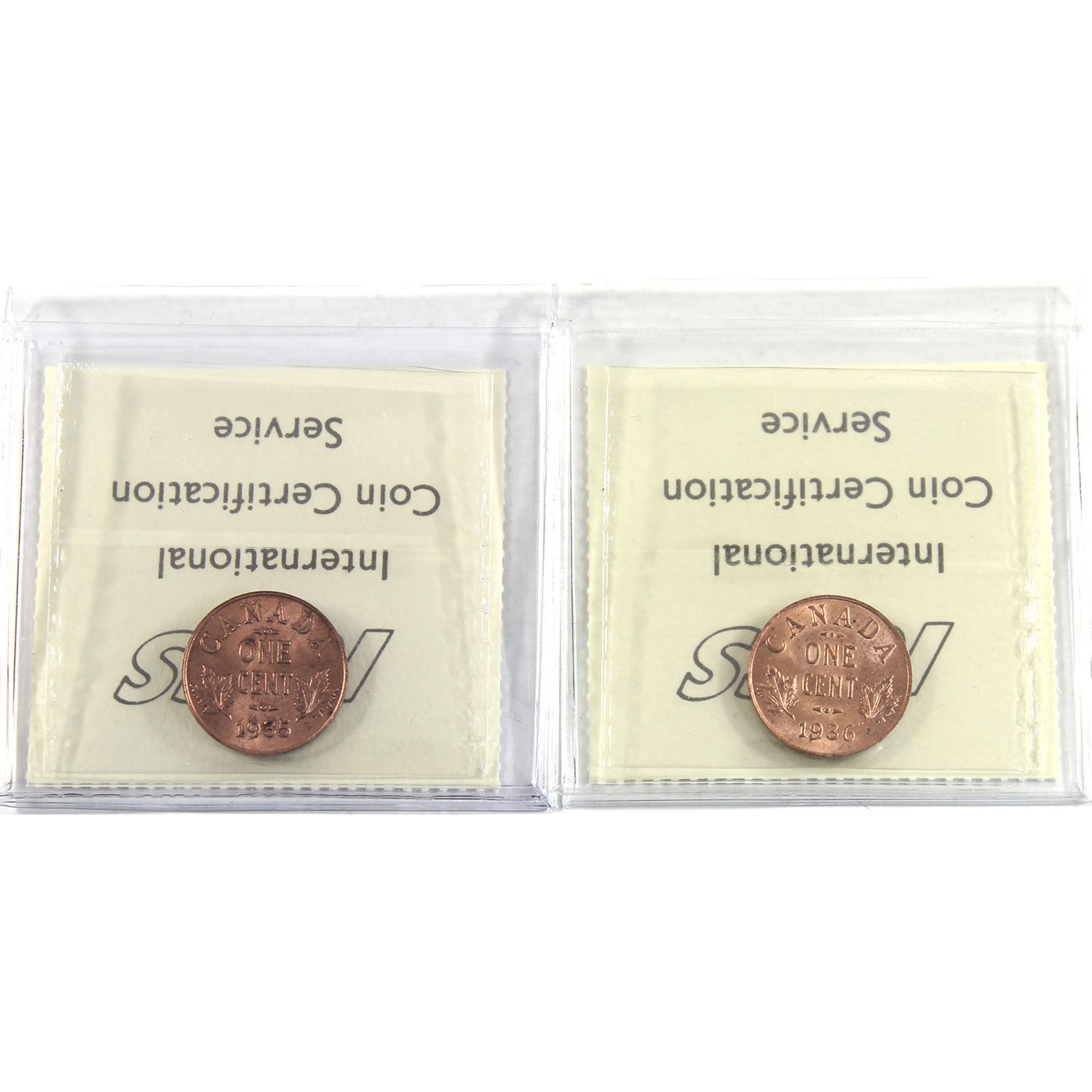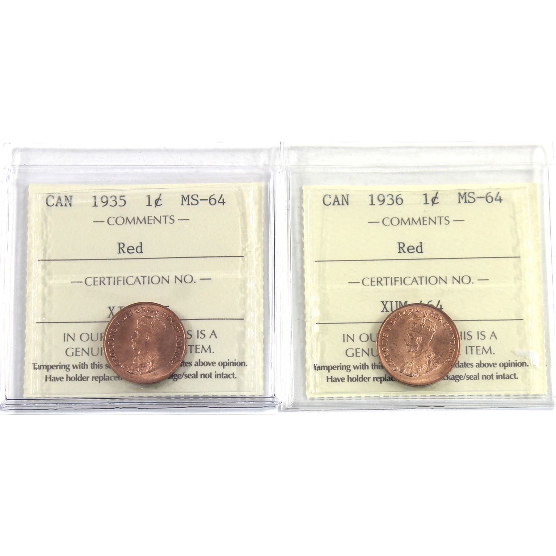 1-cent 1935 & 1936 both ICCS Certified MS-64 RED! A choice set of the last 2 years of George 5th issues (2pcs)