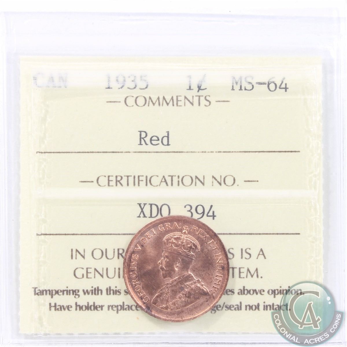1-cent 1935 ICCS Certified MS-64 RED. A bright flashy Coin!