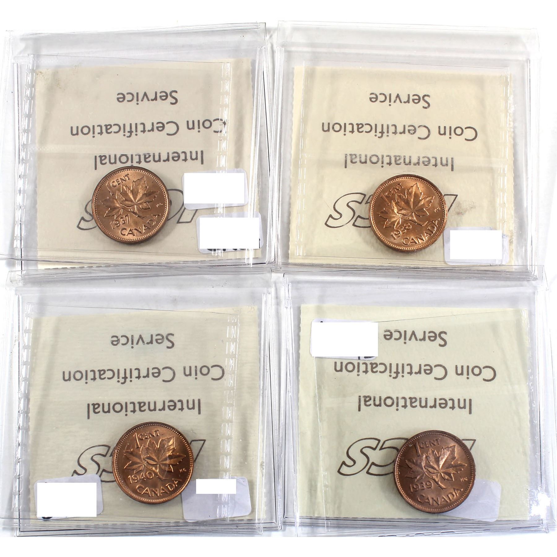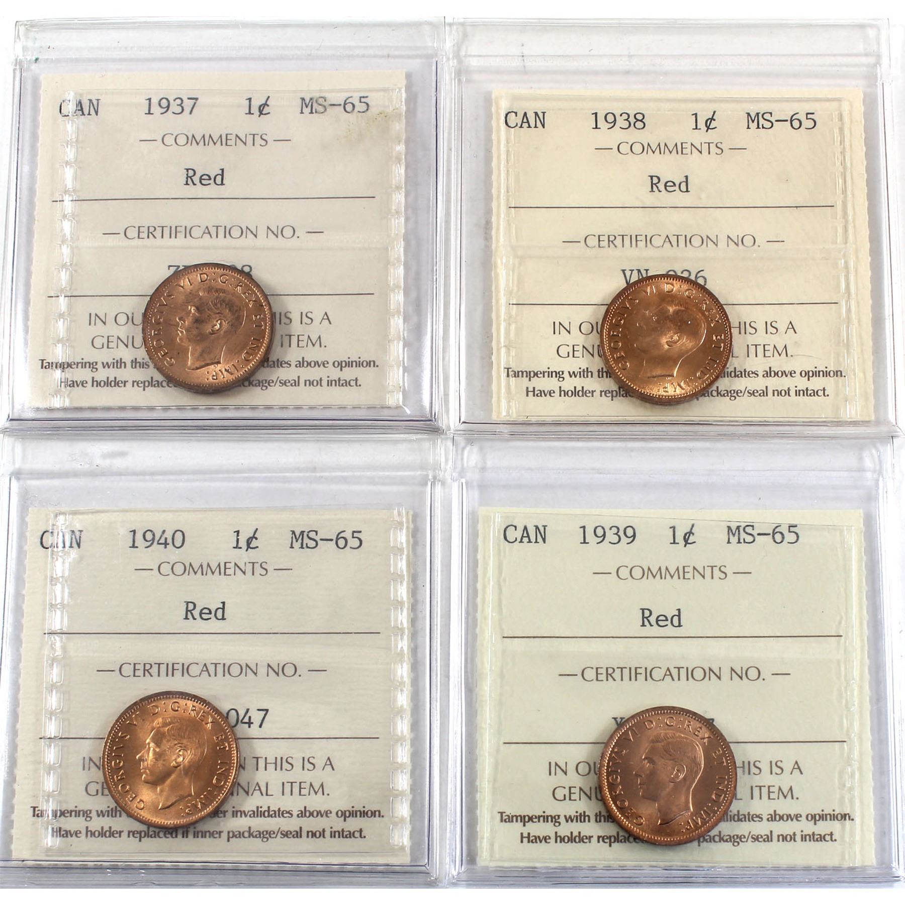 1-cent 1937, 1938, 1939 & 1940 ICCS Certified MS-65. 4pcs