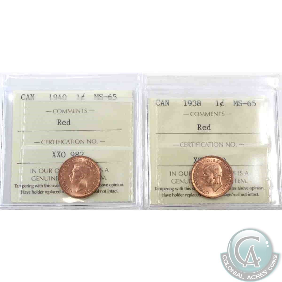 1-cent 1938 & 1940 ICCS Certified MS-65 Red. 2pcs