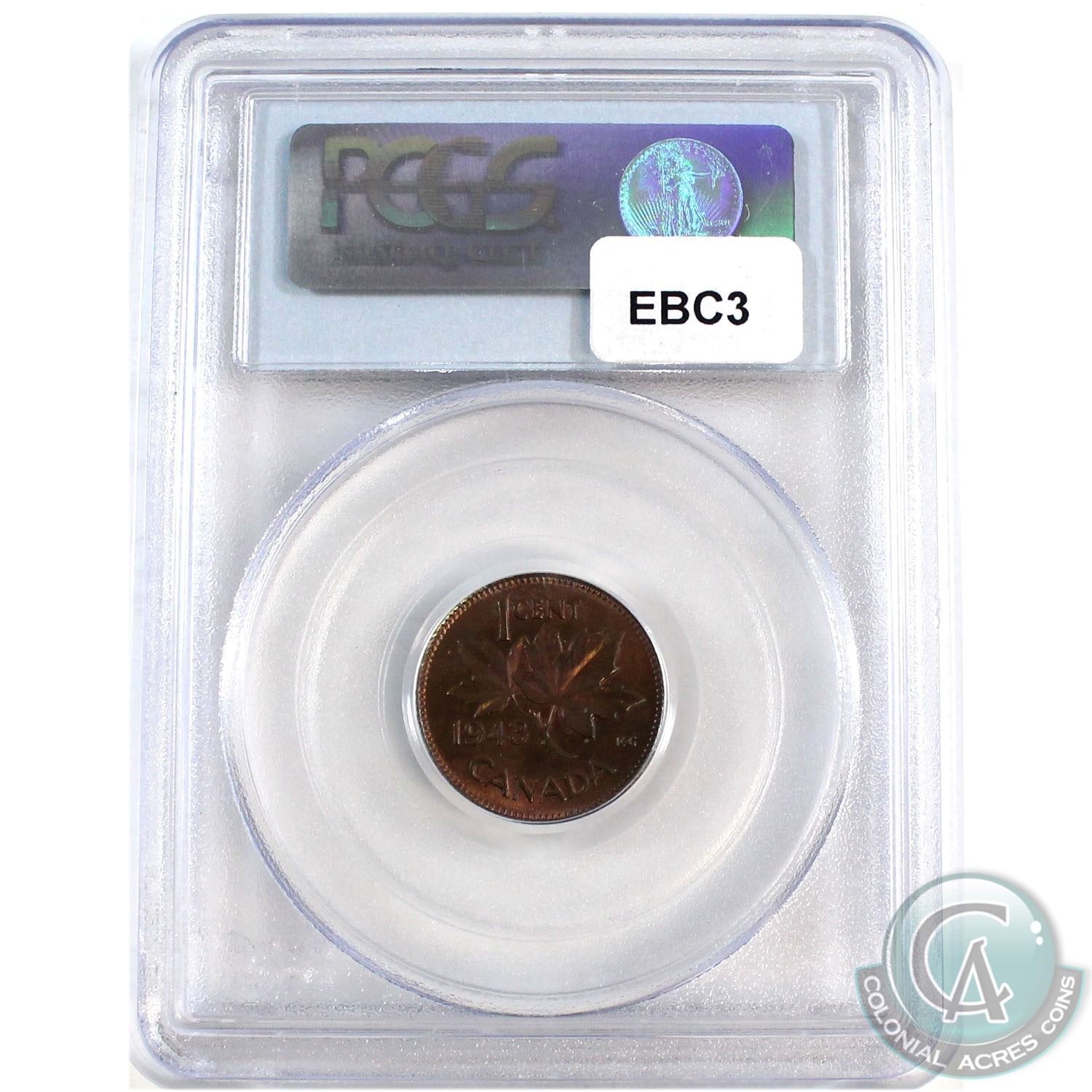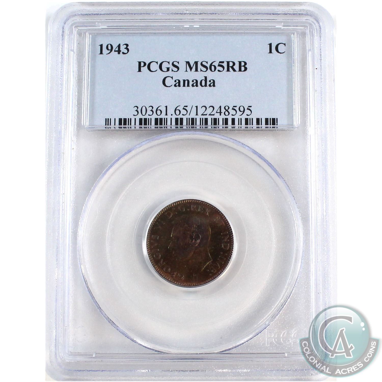 1-cent 1943 Canada 1-cent PCGS Certified MS-65 RB. Coin contains attractive olive green, and violet tones.