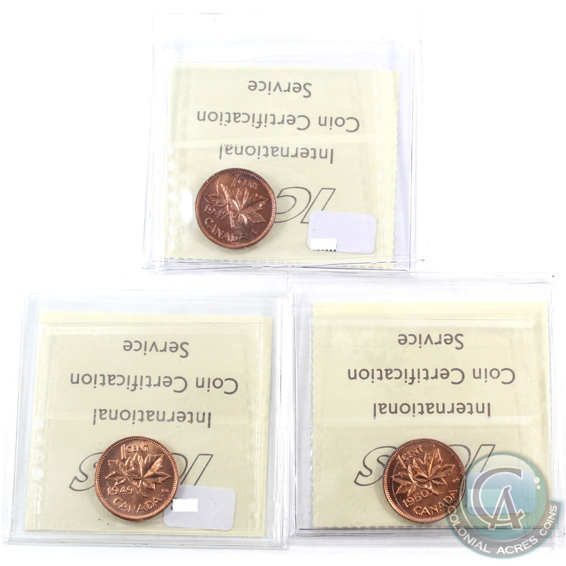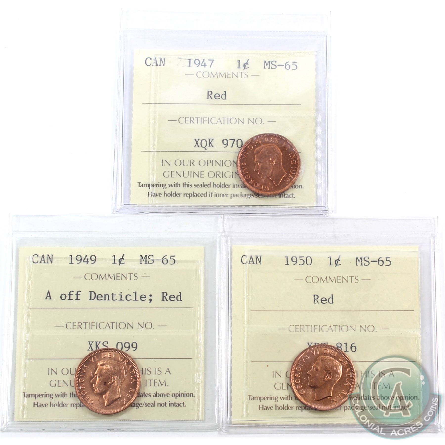 1-cent 1947, 1949 A of Denticle & 1950 ICCS Certified MS-65 Red. 3pcs. All coins are full red.