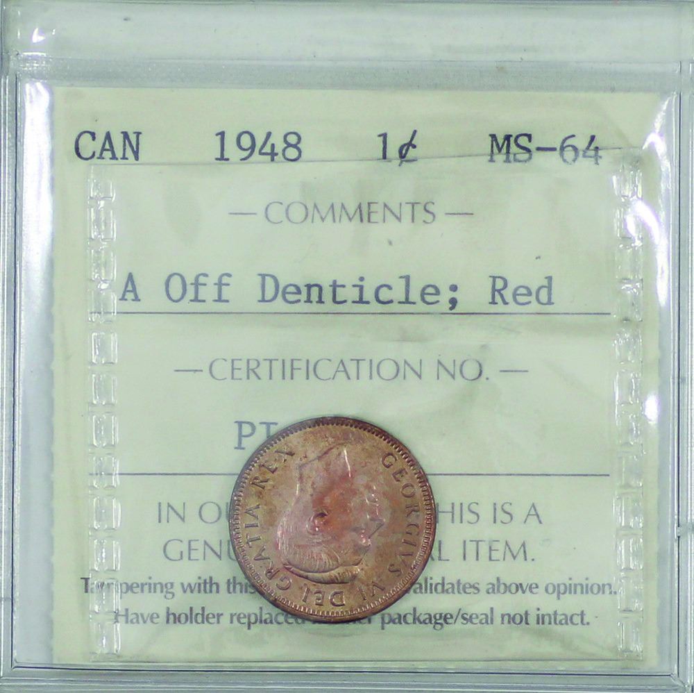 1-cent 1948 A Off Denticle ICCS Certified MS-64 Red. An exceptional example with high glossy fields.