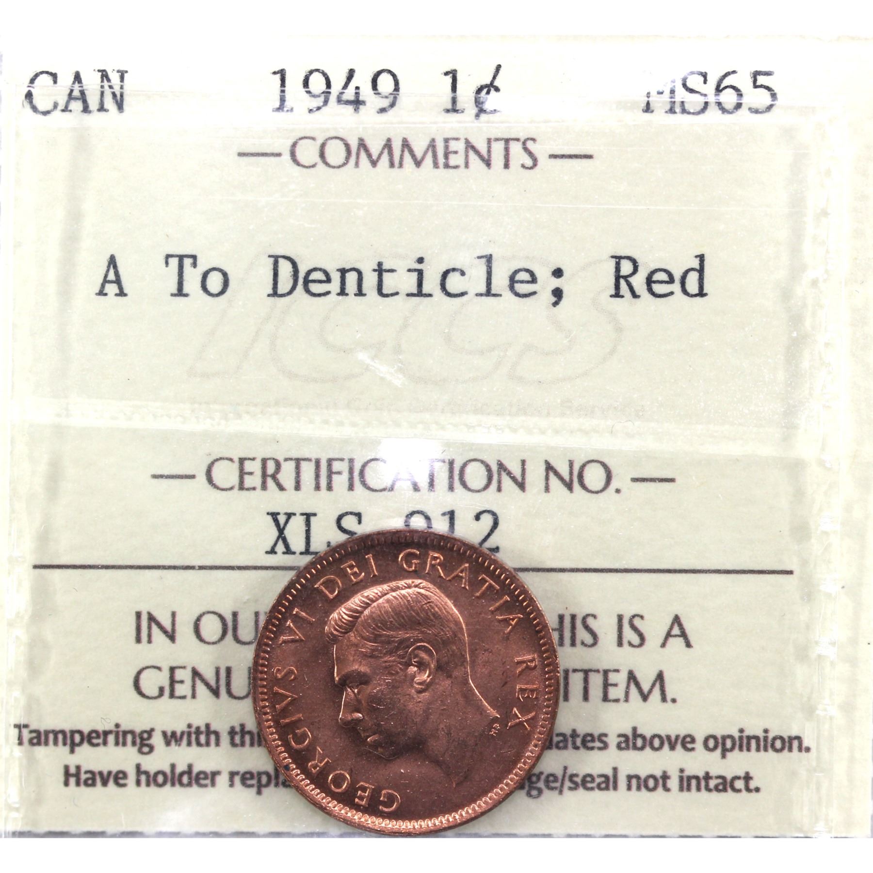 1-cent 1949 A to Denticle ICCS Certified MS-65 Red. Exceptional eye appeal. worth a premium Bid!