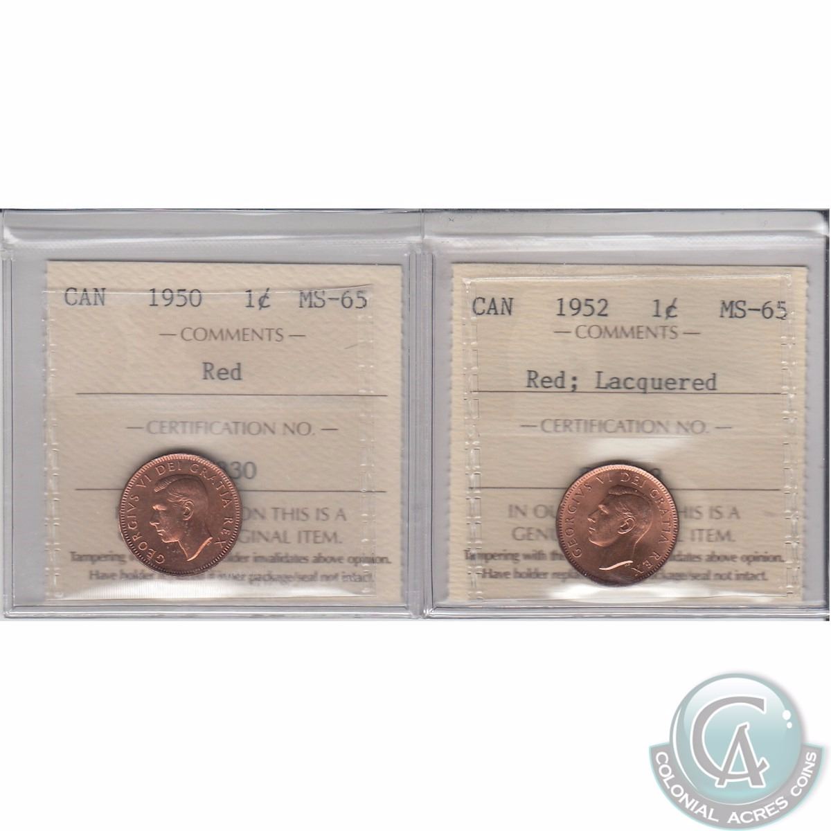 1-cent 1950 & 1952 Lacquered ICCS Certified MS-65. 2pcs