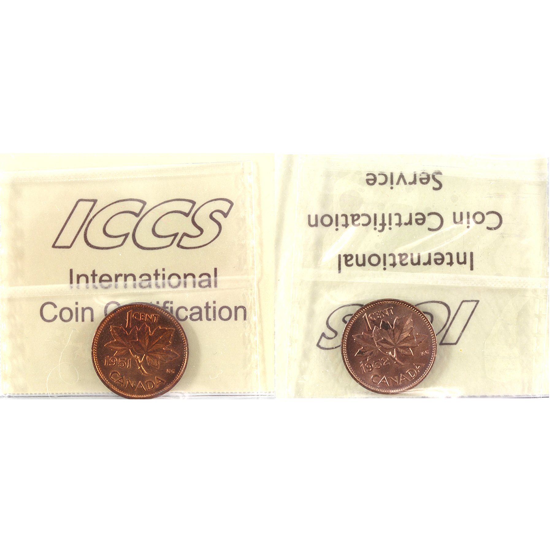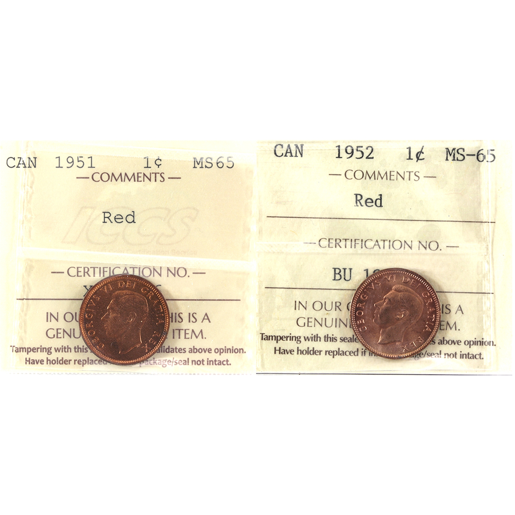 1-cent 1951 & 1952 ICCS MS65 Red. 2pcs.