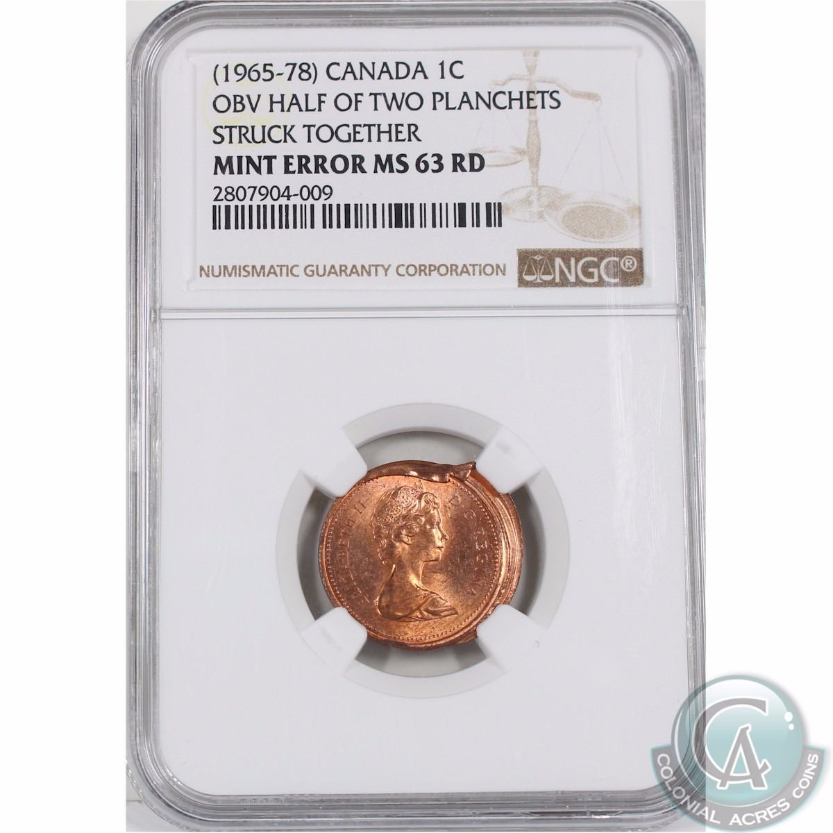 1-cent (1965-1978) Obverse half of 2 Planchet Struck Together. NGC Certified MS-63 Red! An Impressive error with excess metal flaring from portions of the rim.
