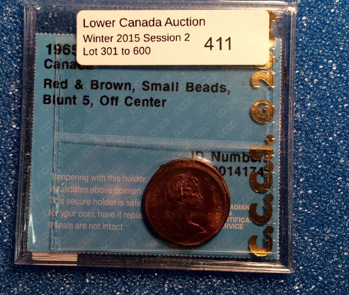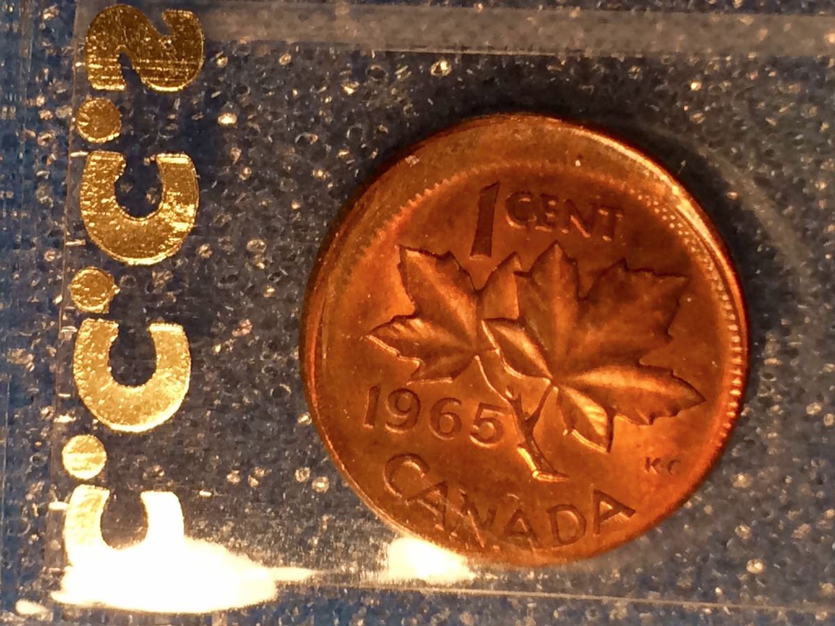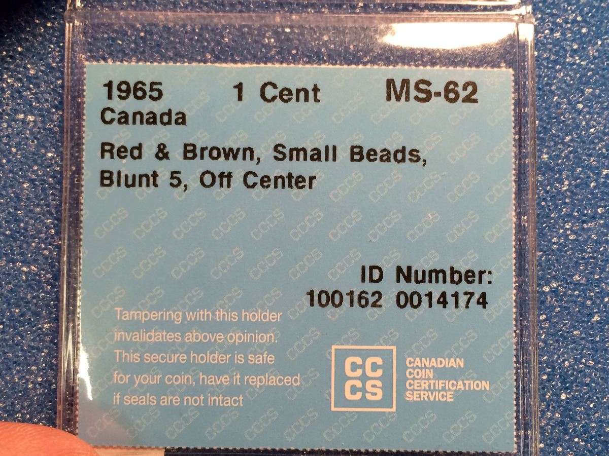 1 cent 1965; CCCS certified MS-62 Red & Brown, Small Beads, Blunt 5, Off Center.