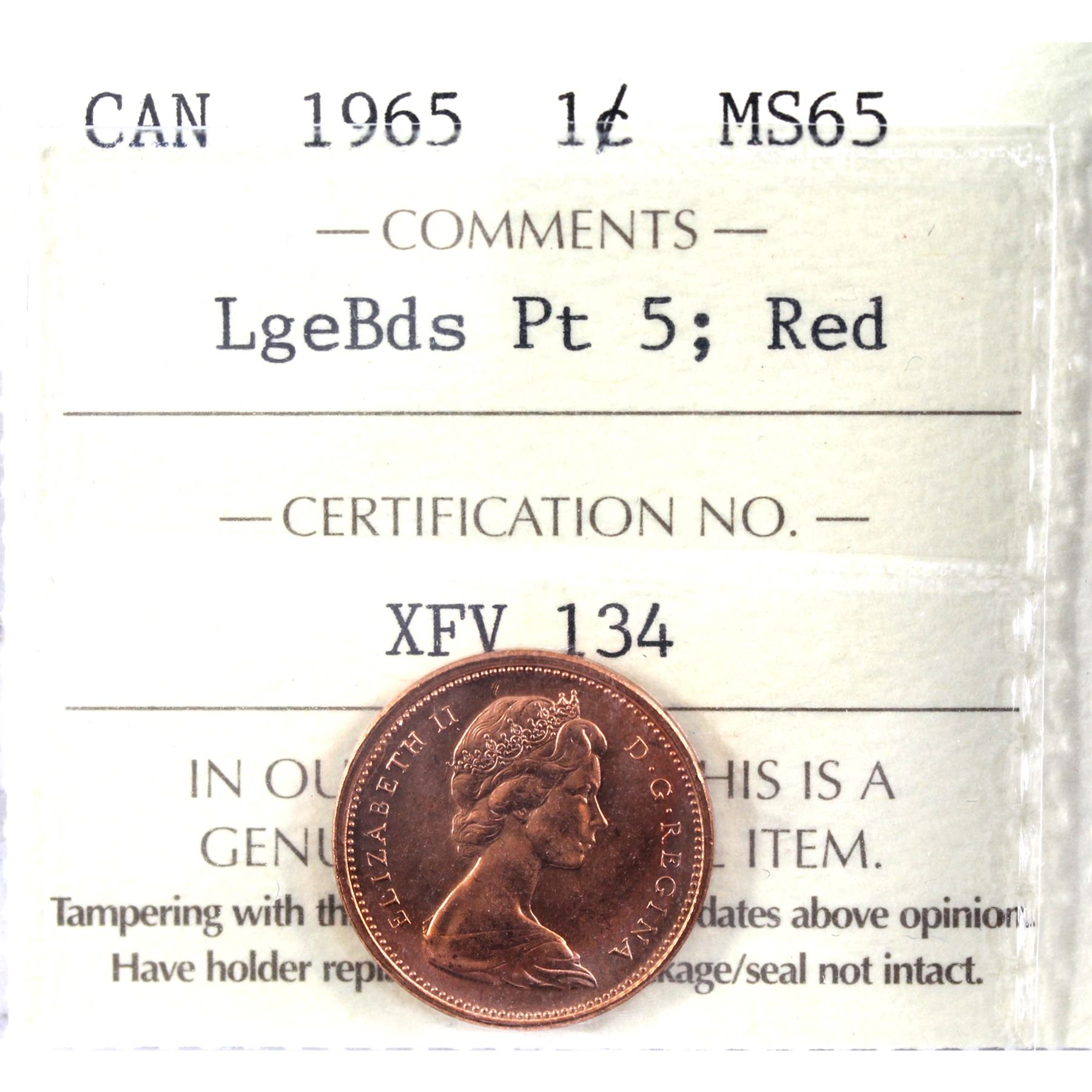 1-cent 1965 Large Beads Pointed 5 ICCS Certified MS-65 Red.