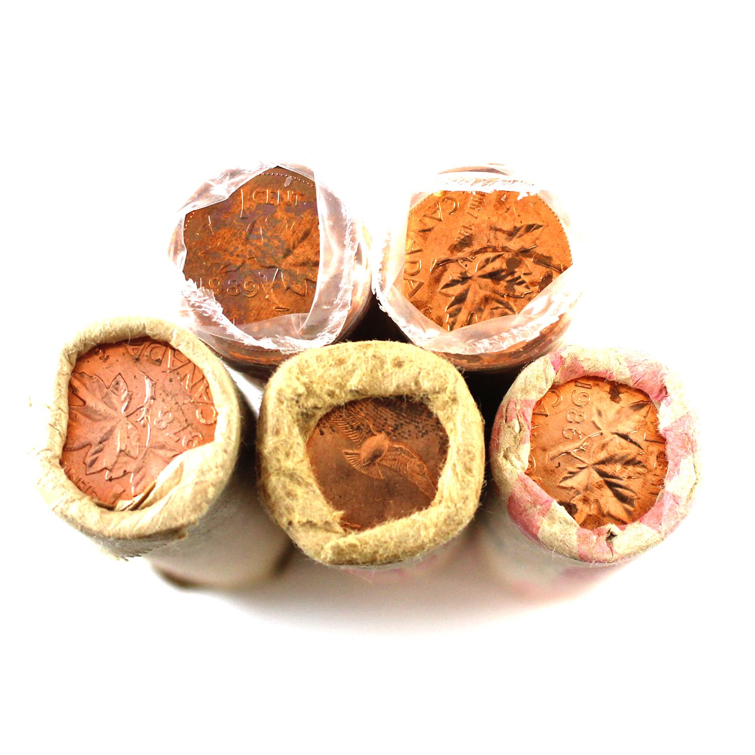 1-cent 1967,1978,1986,1989 & 1992 Original Roll of 50pcs. Small tear on 1978 Wrapper. 5 rolls.