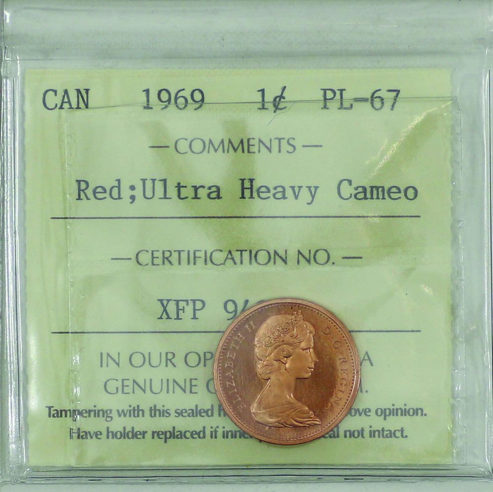 1-cent 1969 ICCS Certified PL-67 Red; Ultra Heavy Cameo. Solo highest graded by ICCS!