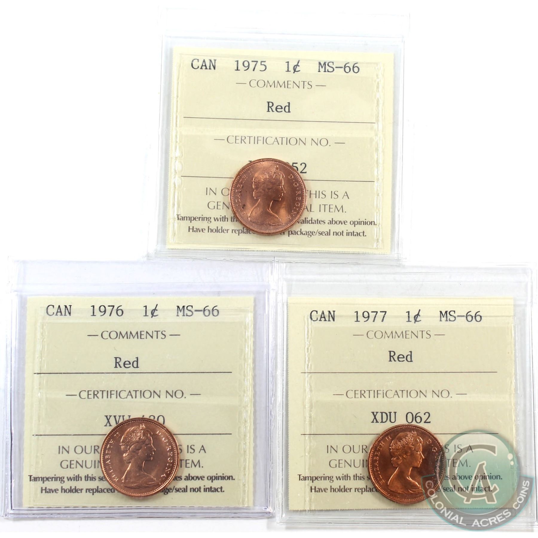 1-cent 1975, 1976 & 1977 ICCS Certified MS-66 Red. 3pcs