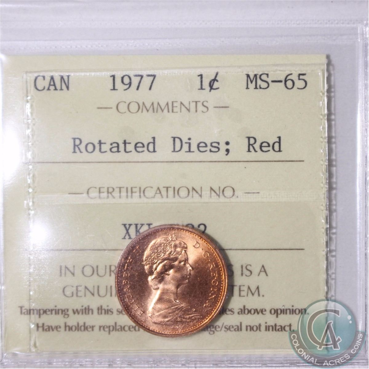 1-cent 1977 Rotated Dies ICCS Certified MS-65; Red (minor rotation)