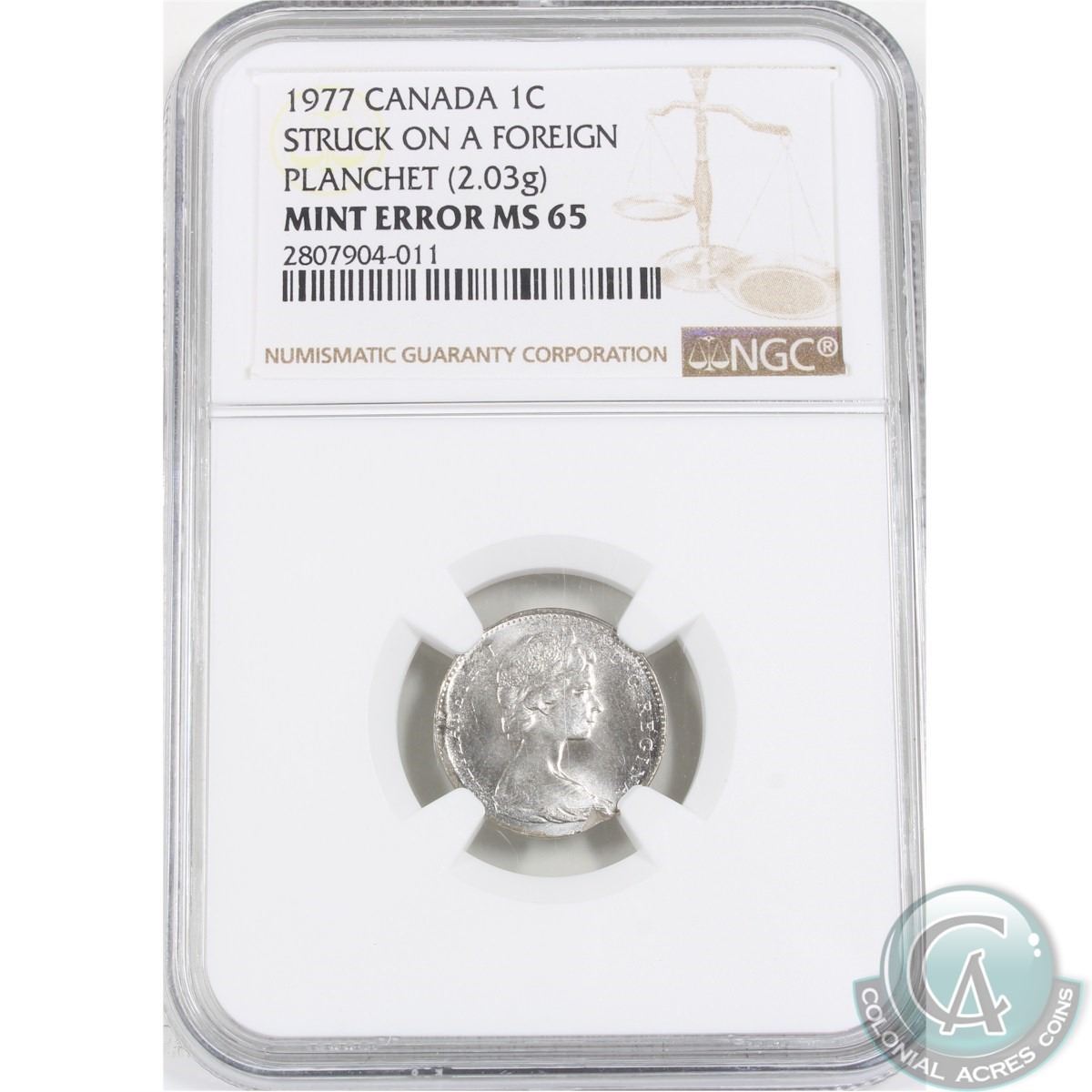 1-cent 1977 Struck on a Foreign Planchet (2.03g) NGC Certified MS-65. Planchet is Magnetic.