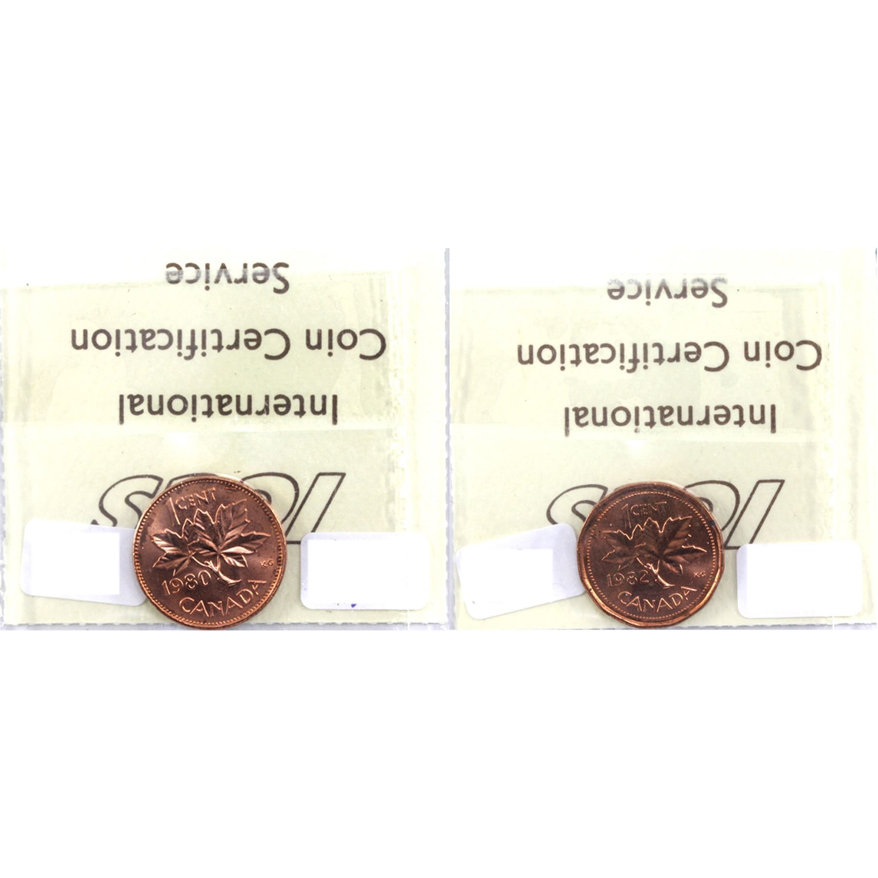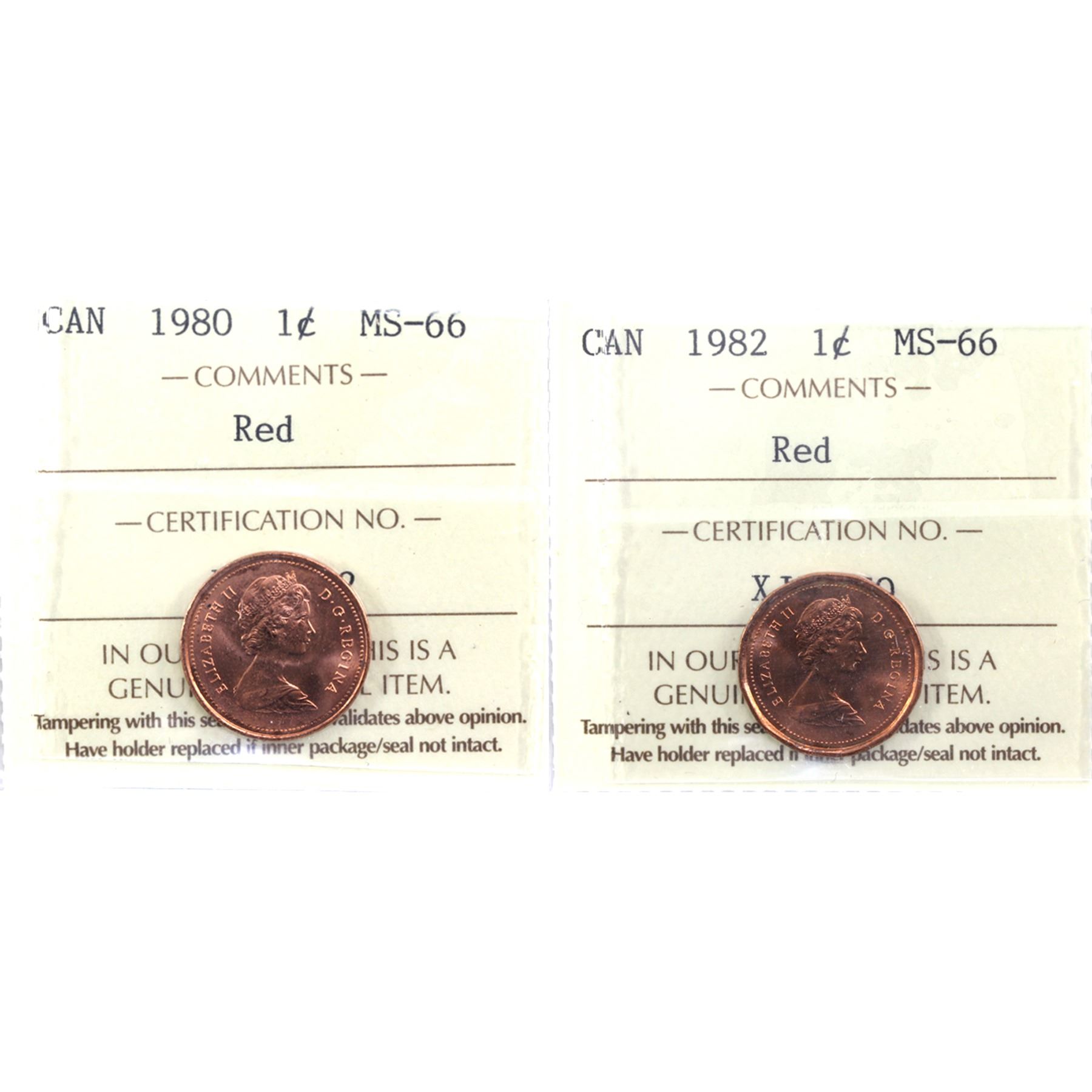 1-cent 1980 & 1982 ICCS Certified MS-66 Red. 2pcs