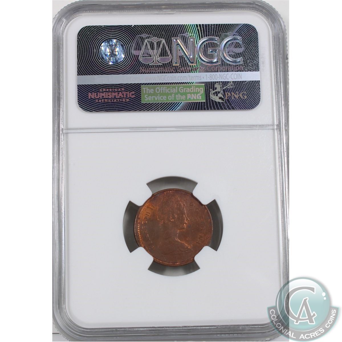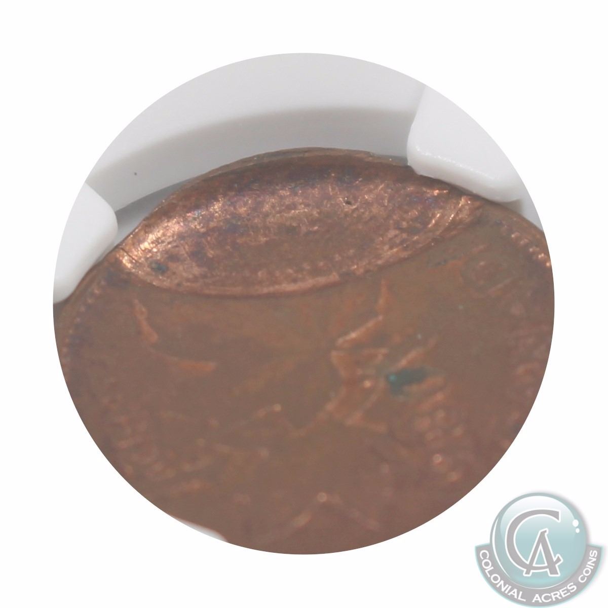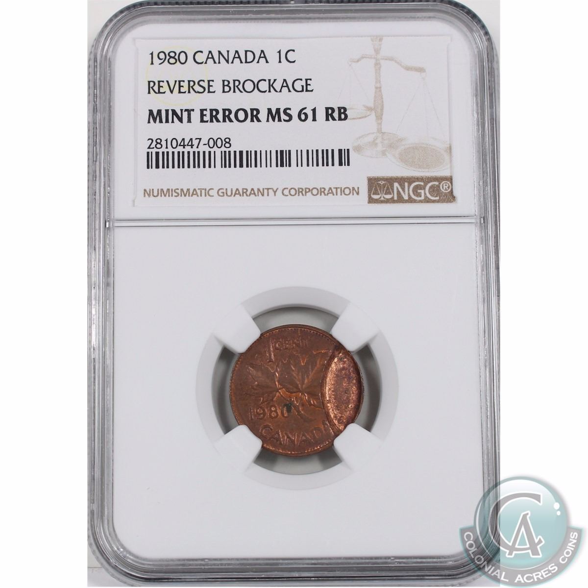 1-cent 1980 Reverse Brockage NGC Certified MS-61 RB. This partial Brockage covers approximately 30% of the Reverse.