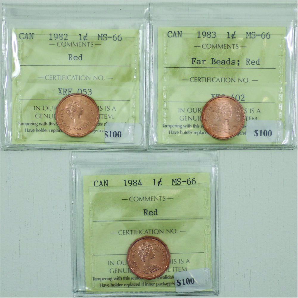 1-cent 1982, 1983 Far Beads & 1984 ICCS MS-66 Red. 3pcs