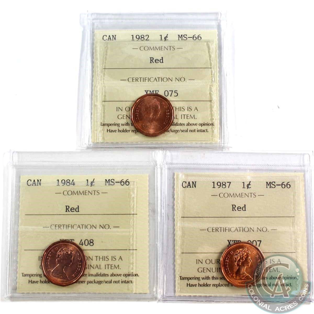 1-cent 1982, 1984 & 1987 ICCS Certified MS-66; Red. Only 2 Graded Higher by ICCS. 3pcs