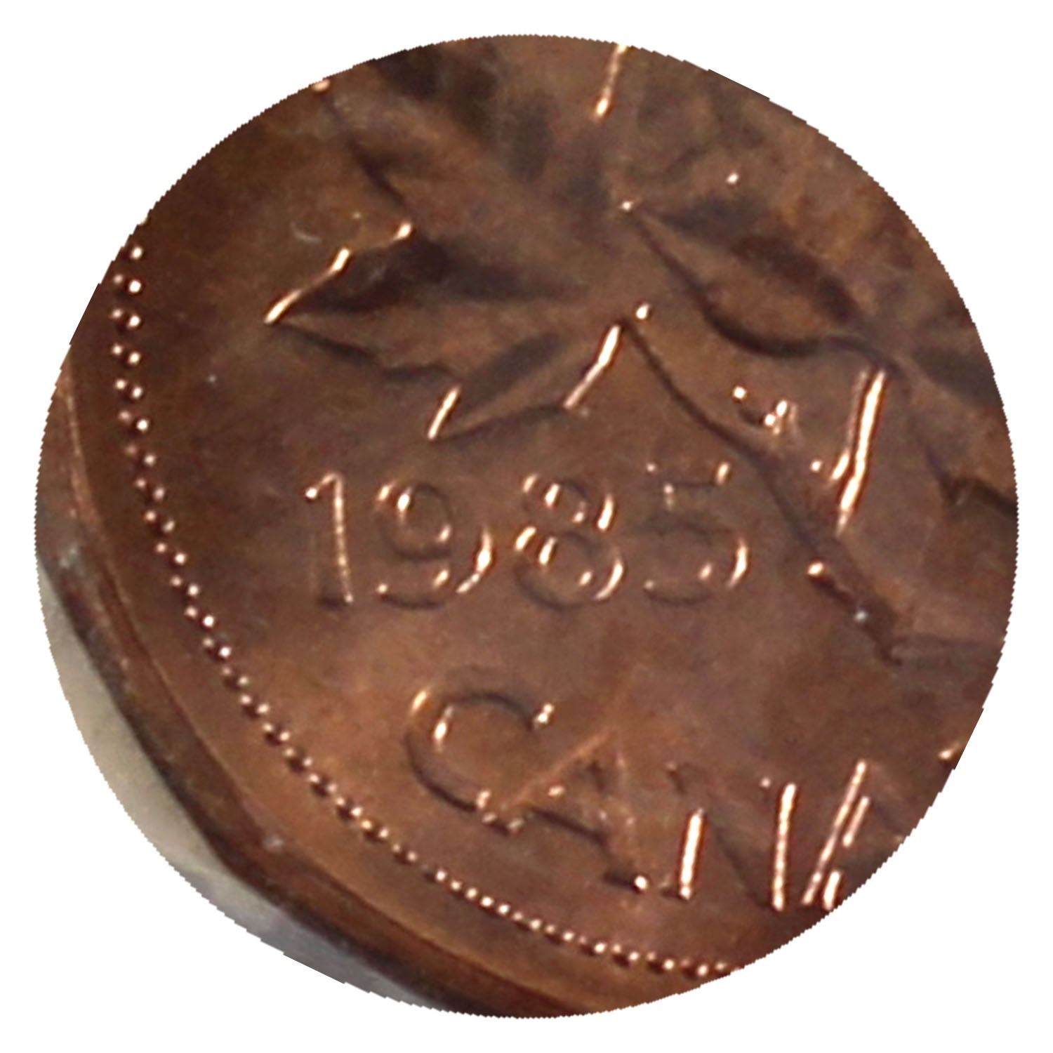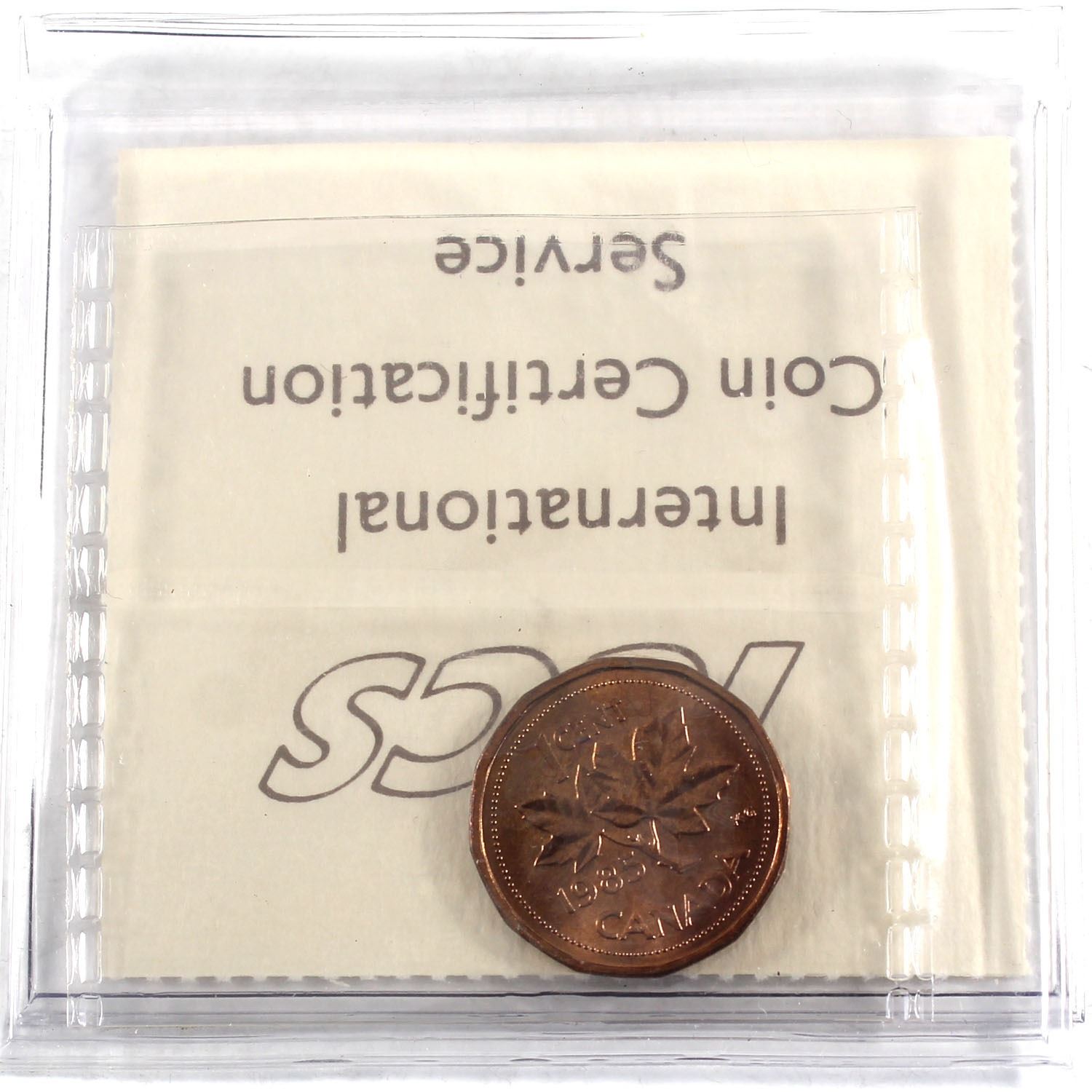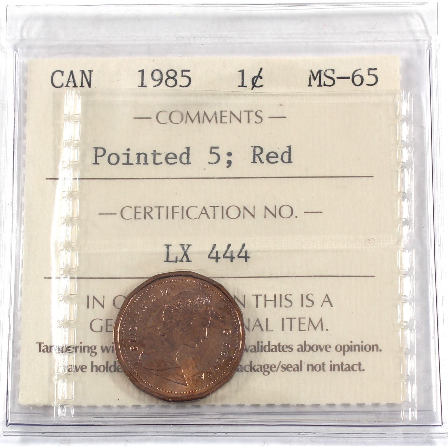 1-cent 1985 Pointed 5, ICCS Certified MS-65 RED!