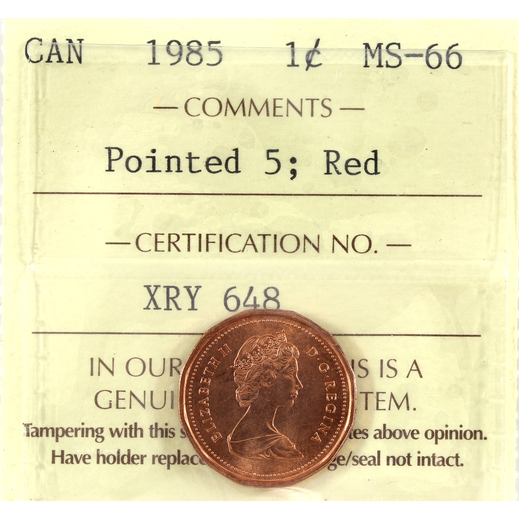 1-cent 1985 Pointed 5 ICCS MS66 Red