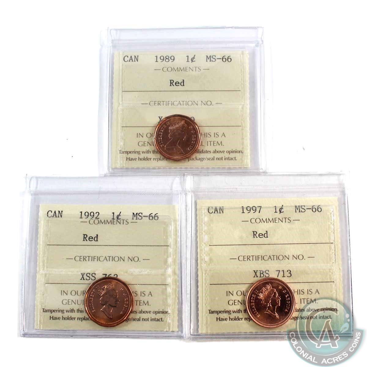1-cent 1989, 1992 & 1997 ICCS Certified MS-66. 3pcs