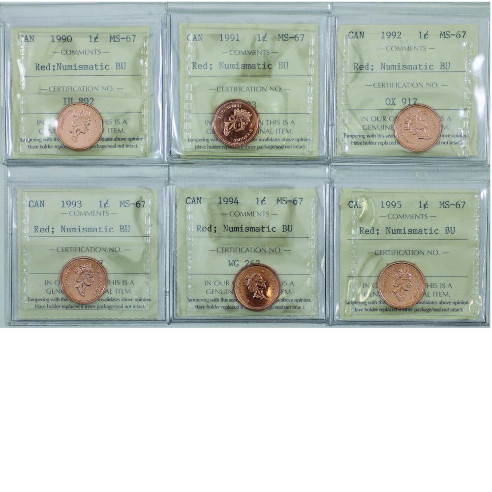1-cent 1990, 1991, 1992, 1993, 1994 and 1995 ICCS Certified MS-67 Red; NBU.
