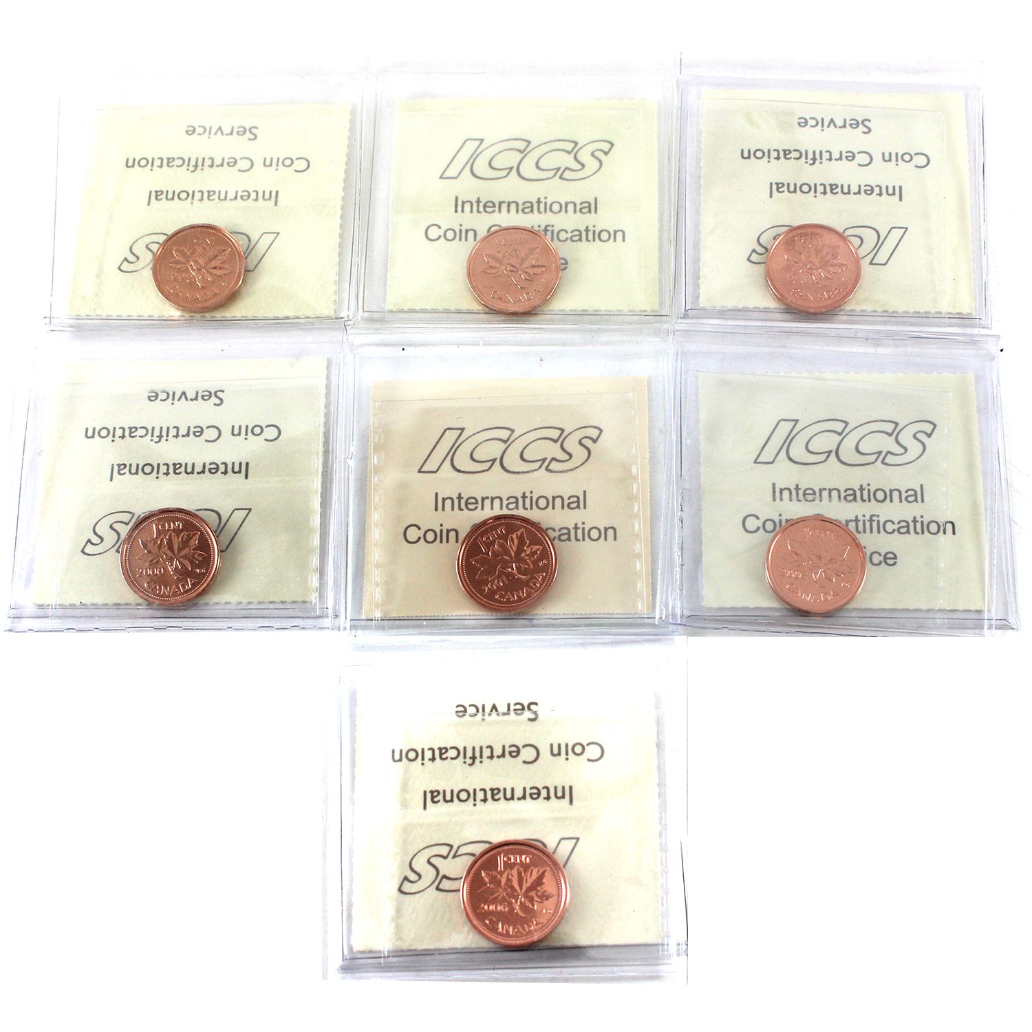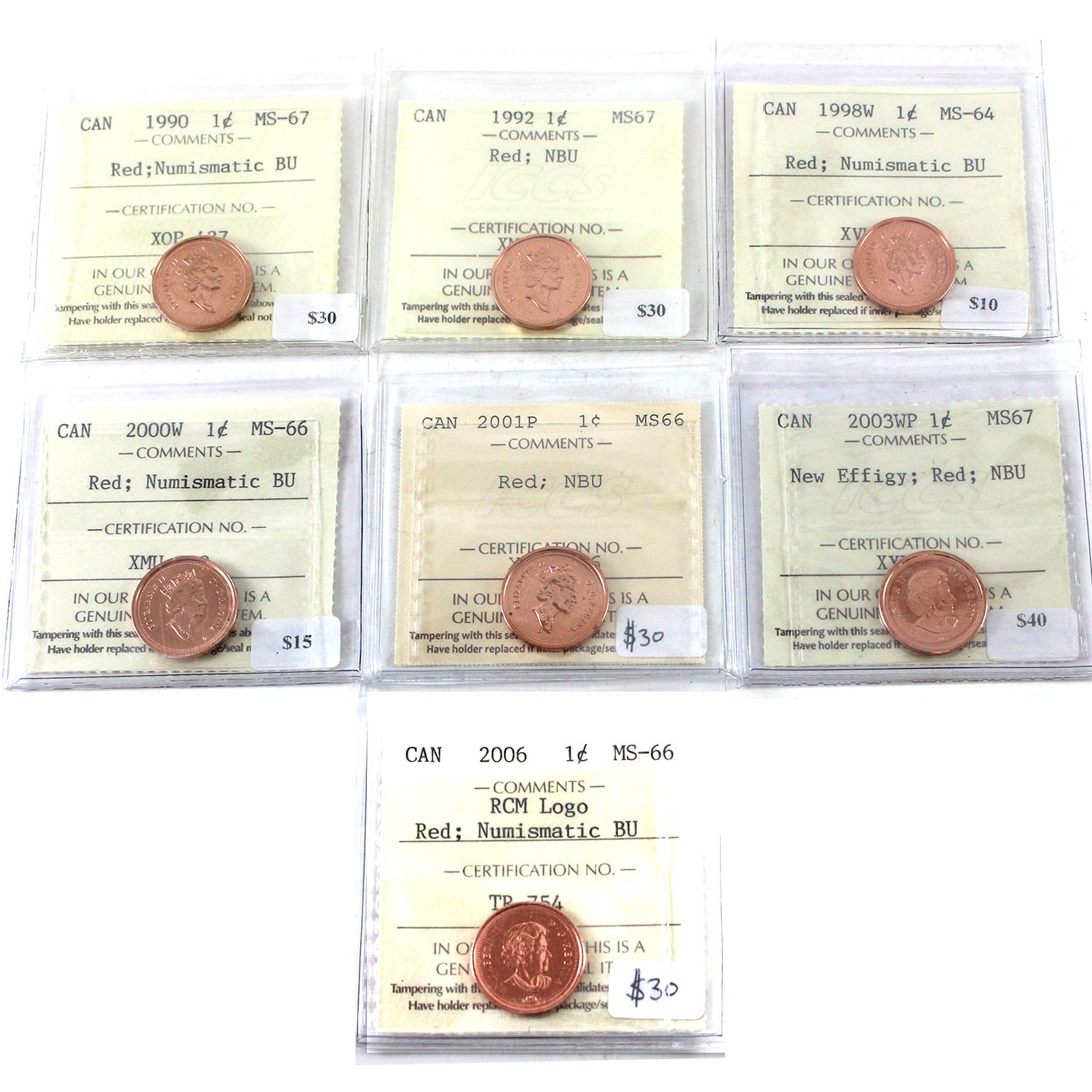 INCLUDES: 1-cent 1990 MS67, 1992 MS67, 1998W MS64, 2000W MS66, 2001P MS66, 2003WP New Effigy MS67, 2006 RCM Logo MS66. 7pcs.