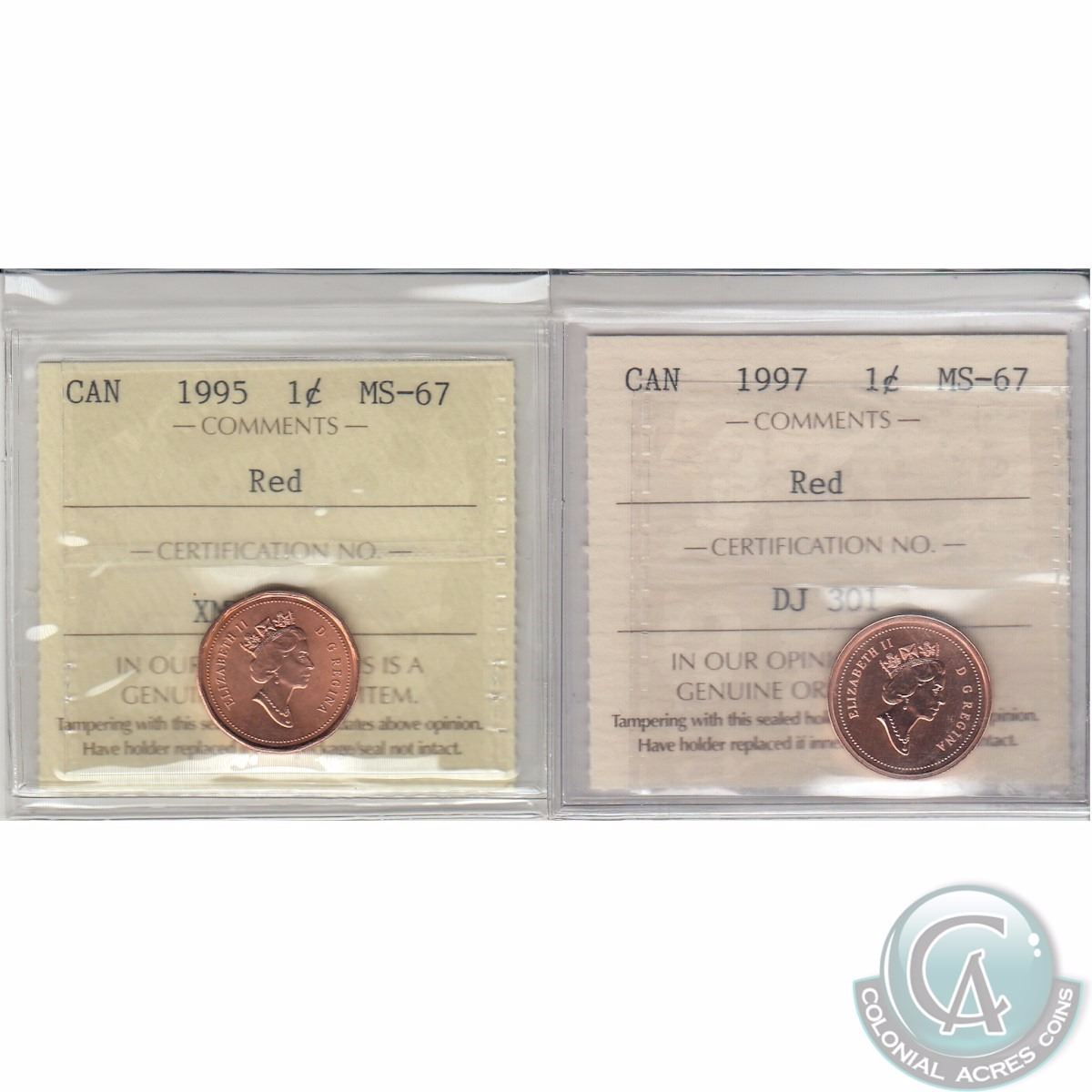 1-cent 1995 & 1997 ICCS Certified MS-67 Red. 2pcs
