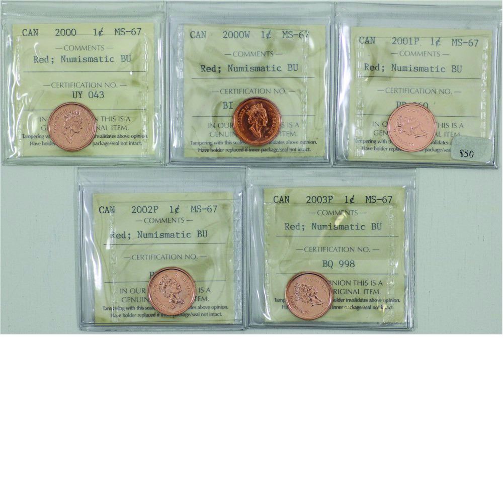 1-cent 2000, 2000W, 2001P, 2002P and 2003P ICCS Certified MS-67 red; NBU. All coins are tied for the
