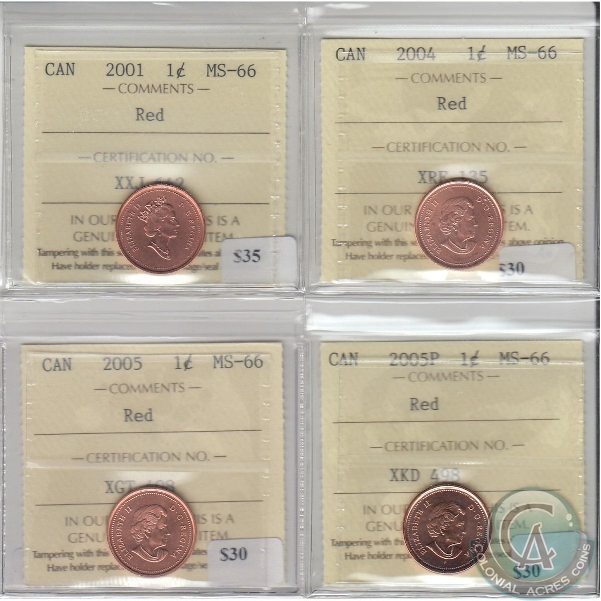 1-cent 2001, 2004, 2005 & 2005P ICCS Certified MS-66 Red. 4pcs.