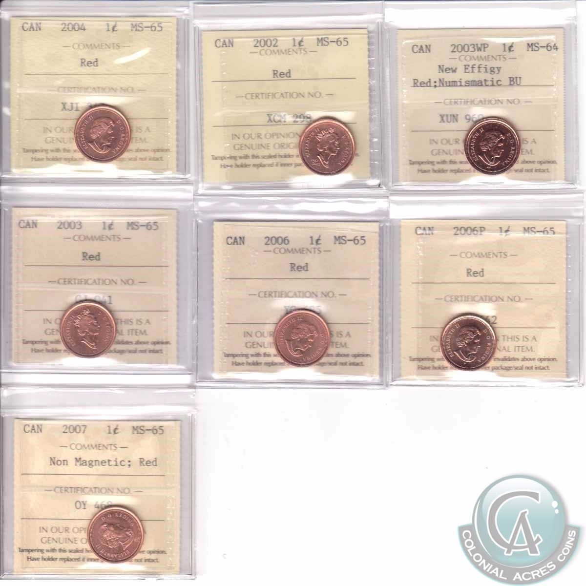 1-cent 2002, 2003, 2003WP New Effigy NBU, 2004, 2006, 2006P & 2007 Non Magnetic ICCS Certified MS-65. 7pcs