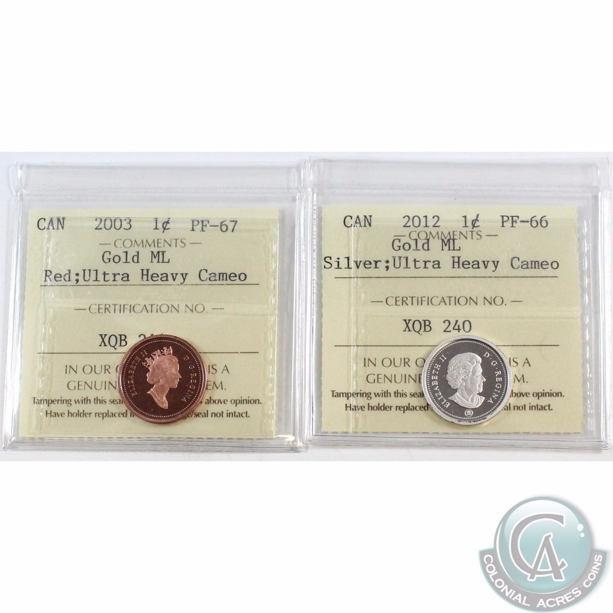 1-cent 2003 Gold ML ICCS Certified PF-67 Red Ultra Heavy Cameo & 2012 Gold ML Silver PF-66 Ultra Heavy Cameo. 2pcs
