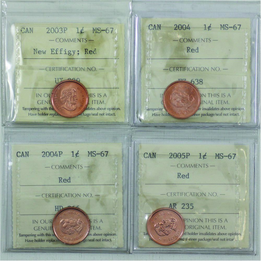 1-cent 2003P New Effigy, 2004, 2004P and 2005P ICCS Certified MS-67 Red. All coins are tied for the