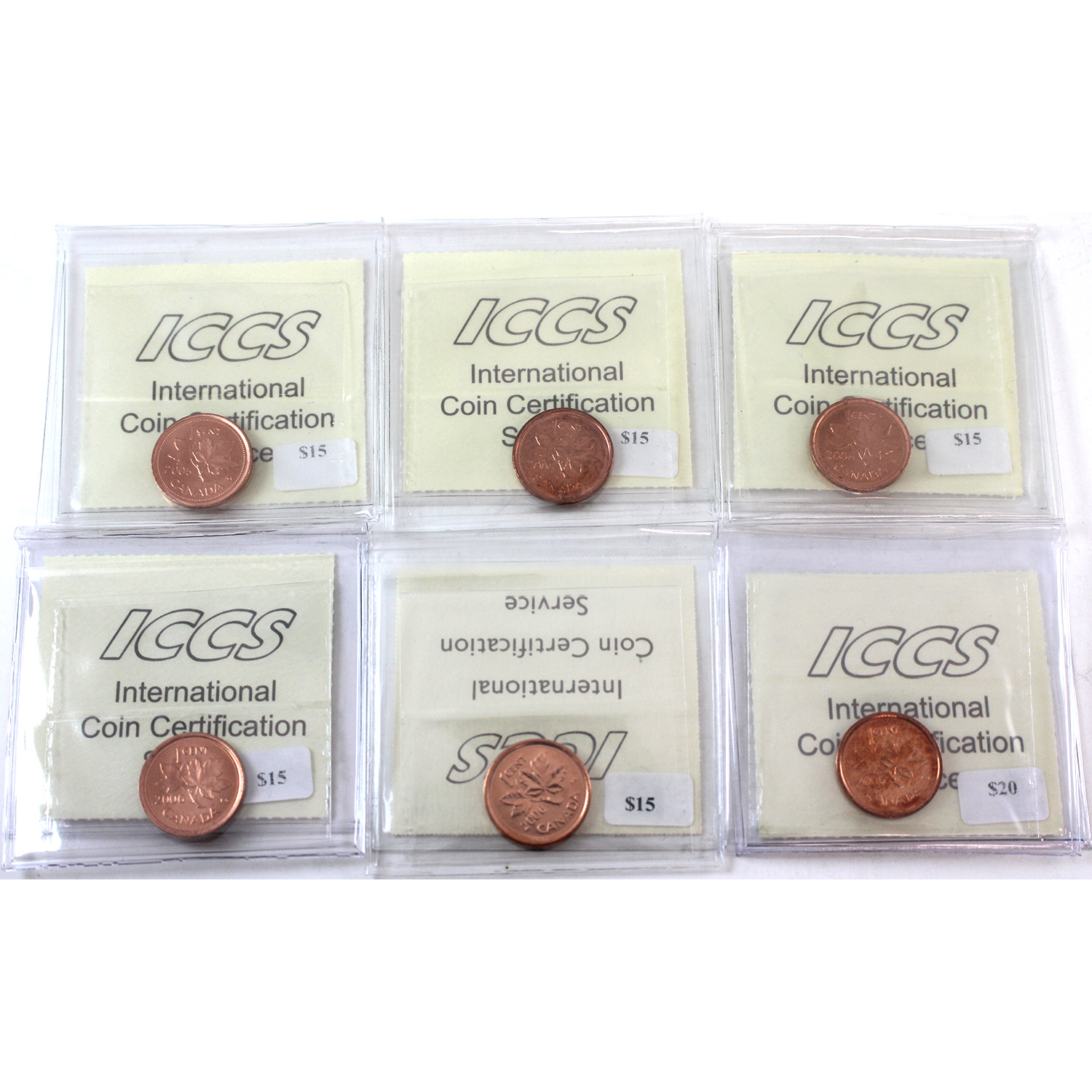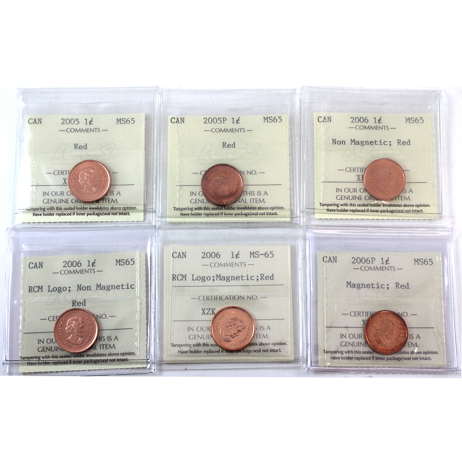 1-cent 2005, 2005P, 2006 Non-Mag, 2006 Logo Non-Mag, 2006 Logo Mag & 2006P Mag ICCS MS65 Red. 6pcs