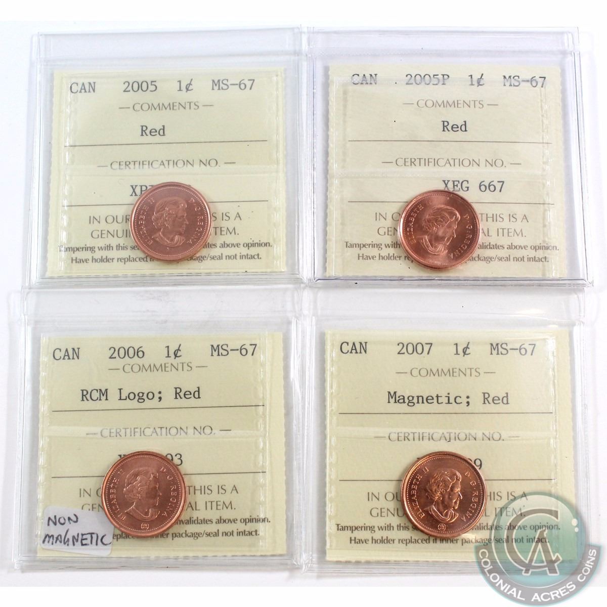 1-cent 2005, 2005P, 2006 RCM Logo, 2007 Magnetic, ICCS Certified MS-67 Red. 4pcs.