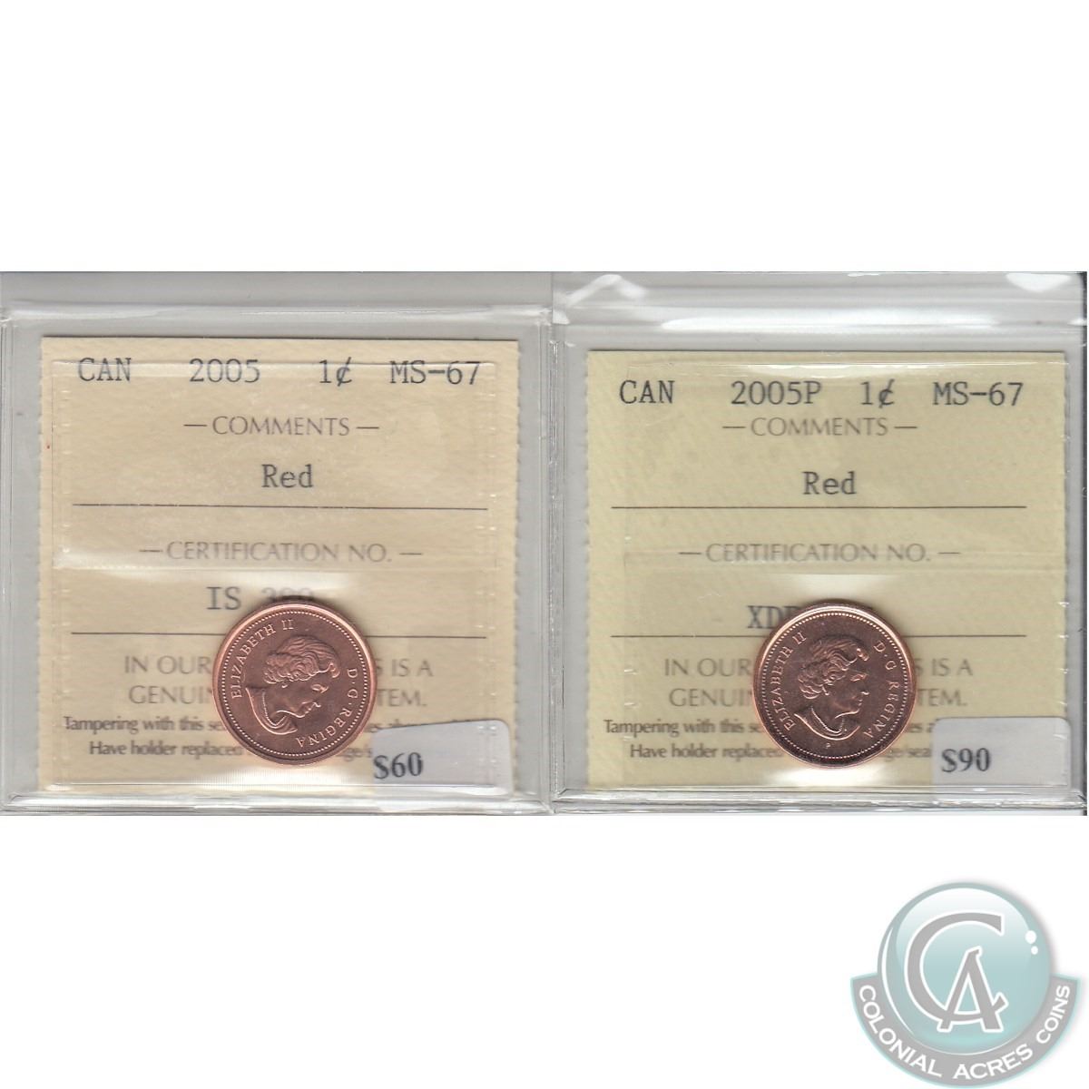 1-cent 2005 & 2005P ICCS Certified MS-67 Red. 2pcs.